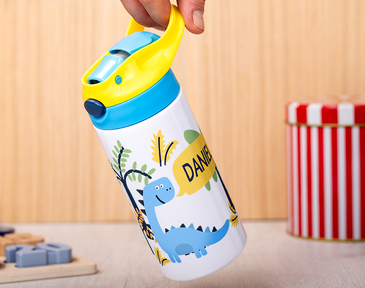 ¿El más peque de la casa está obsesionado con los dinosaurios? Si tiene un montón de peluches, juguetes, muñecos de dinosaurios tenemos algo que no le puede faltar. Se trata de nuestra botella tricolor con estampado de dinosaurio, sin duda, le encantará. Imagina la ilusión que le hará recibir este regalo tan original. Esta botella de agua es ideal para que se la lleve al cole o a las excursiones. ¡Así estará siempre bien hidratado! Además, tiene un tapón de lo más ergonómico con una pajita perfecta para que el peque pueda beber sin derramar ni una gota. ¡Es genial! Existe la posibilidad de elegir el color del tapón, entre: azul o rosa. Y lo mejor: es personalizable, podrás escribir el nombre del más peque de la casa. ¡Así todos sabrán de quien esta botella tan chula! Personalizar esta botella tricolor es súper sencillo. El primer paso a seguir consiste en añadir el producto al carrito y entrar al área de personalización. Una vez ahí, ya puedes escribir el nombre del más peque de la casa. Pronto quedará perfecta y lista para regalar. ¡Un original regalo para niños! Altura de la botella: 17 cm. Diámetro de la base de la botella: 7 cm. Capacidad: 360 ml. Material: Acero inoxidable.