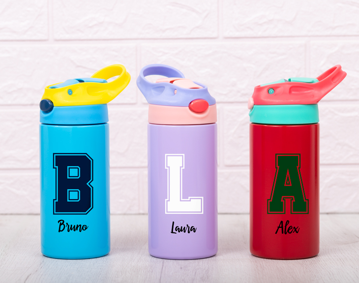 Ahora que llega la vuelta al cole, refresca la rutina del más peque con nuestra botella colours. Es buena forma de enseñarle a tu hijo la importancia de beber agua en su día a día, gracias a esta botella conseguirás que beba sus dos litros de agua diarios. Además, de ser práctica, se convertirá en su compañera de aventuras escolares. ¡Será un regalo de lo más original! Cada sorbo en esta botella de agua colours será una experiencia única. Tiene una boquilla de silicona perfecta para que los más peques beban cómodamente sin derramar. Está hecha de acero inoxidable y tiene la posibilidad de elegir entre tres colores. Tiene una capacidad de 500ml. ¡Podrá llevarse su bebida favorita a cualquier lugar! Es ideal para llevar al cole, a las excursiones, a las actividades extraescolares, ¡a donde quiera que vaya! Lo mejor que tiene es que es personalizable. ¡No habrá otra botella igual! Podrás escribir el nombre de tu hijo o hija. Y, además, elegir una inicial de nuestro alfabeto college. ¡Olvídate de tener que poner su nombre en todo su material escolar! Para personalizarlo, lo primero es añadir el producto al carrito y entrar al área de personalización. En todo momento podrás cómo queda el resultado en la vista previa de nuestra web. Altura de la botella: 17 cm. Diámetro de la base de la botella: 7 cm. Capacidad: 360 ml. Material: Acero inoxidable.