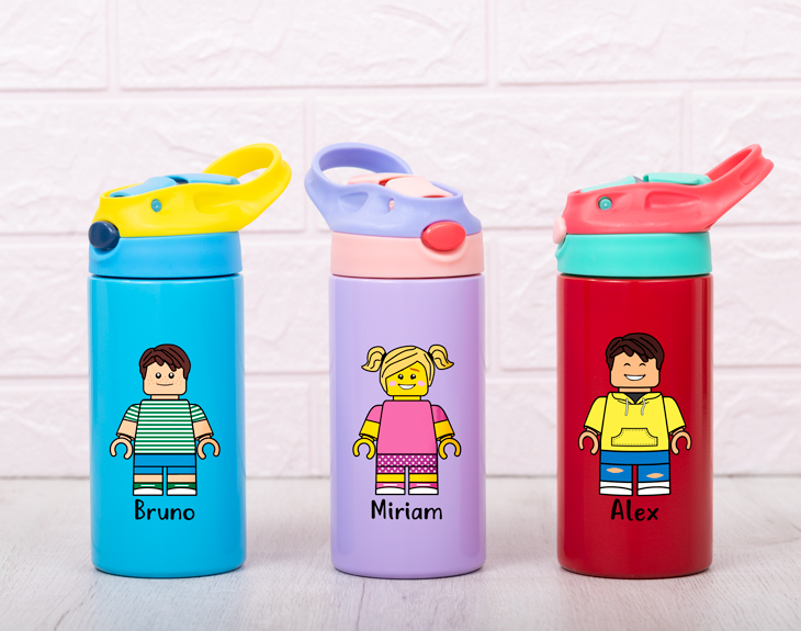 Ahora que llega la vuelta al cole, tu hijo va a pasar más tiempo fuera de casa, entre clases y actividades extraescolares. Si va a echar de menos esas tardes en las que os pasabais las horas jugando con las piezas Lego, este detalle, sin duda, es ideal para homenajear esos buenos tiempos. Se trata de nuestra botella Colours. Además, gracias a esta botella conseguirás que tu hijo o hija beba sus dos litros de agua al día. Estará deseando que llegue el primer día de cole para presumir delante de sus compañeros, ¡será la envidia de la clase! Está fabricada de acero inoxidable y tiene una capacidad de 500ml. Existe la posibilidad de elegir el color de la botella entre tres diferentes: rojo, lila y azul. Y lo mejor que tiene, es que es personalizable. Es decir, ¡tú creas tu propio diseño Lego! Y te preguntarás… ¿Cómo se personaliza esta botella de agua? Lo primero es añadir el producto y entrar al área personalización. Una vez ahí, podrás diseñar a tu propio avatar desde cero y escribir el nombre que tú quieras, ¡ya verás qué divertido! Nosotros lo preparamos para que quede listo para regalar. ¡Será un regalo de lo más original! Altura de la botella: 17 cm. Diámetro de la base de la botella: 7 cm. Capacidad: 360 ml. Material: Acero inoxidable.