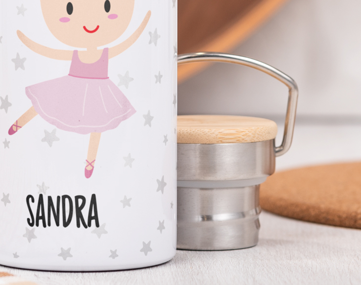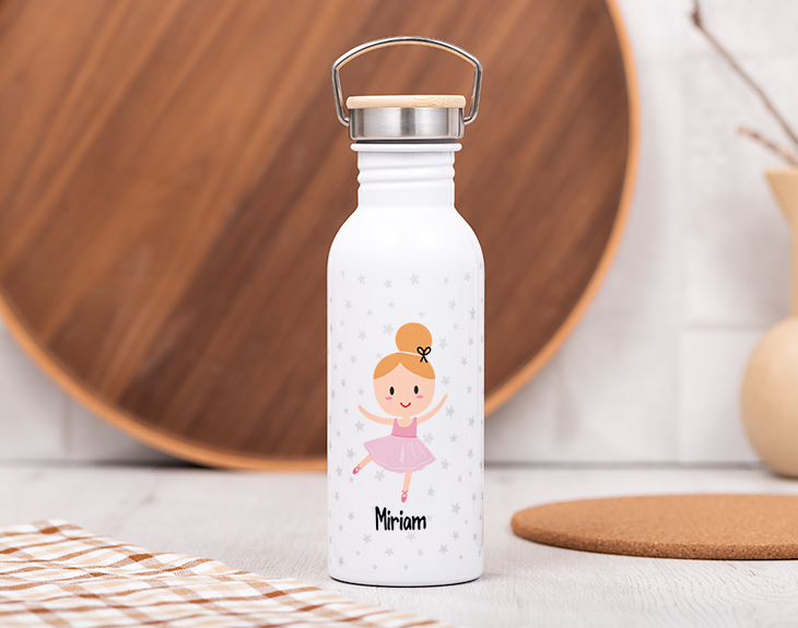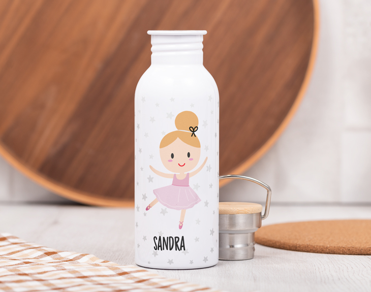 ¿Tu peque empieza el cole y quieres que lo haga con buen pie? ¿Necesitas sorprender a una amiga con un regalo original, bonito y práctico? Con nuestra botella Forest personalizada Bailarina Ballet lo tendrás más que fácil. La posibilidad de personalizarla con el nombre de la destinataria convierte a esta botella en un regalo de lo más exclusivo. El diseño de la botella ya es precioso de por si. Y es que esta elegante botella, de estilo vintage, está fabricada en acero inoxidable y revestida en un elegante color blanco, que hará que el diseño destaque con toda intensidad. Cuenta con un tapón a rosca con detalles en madera y una asita, que pone la guinda a esta decoración tan cuidada y estilosa. Lo mejor, por supuesto, es que podrás personalizar la botella con el nombre de la persona. Su diseño, en el que aparece una tierna bailarina rodeada por estrellitas grises se completa con el nombre que quieras debajo del dibujo. Solo tienes que pulsar en el símbolo + que encontrarás en el diseñador y anotar el texto. La imagen que ves en pantalla, se trasladará directamente a tu nueva botella, ¡lista para sorprender a quien más quieres! No hay regalo más práctico para tus seres queridos que una botella que puedan usar en sus clases, trabajo o incluso en el gimnasio. Pero si deseas que, además de práctico, sea un regalo original, no dudes que la opción de personalizarlo conseguirá su objetivo. La destinataria se enamorará de su preciosa bailarina, sobre todo si ella misma es una apasionada del baile. ¡La llevará a todas partes y, cada vez que la use, se acordará de ti! Altura de la botella: 22,5 cm. Diámetro de la base de la botella: 7,3 cm. Capacidad: 620 ml. Material: Acero inoxidable.