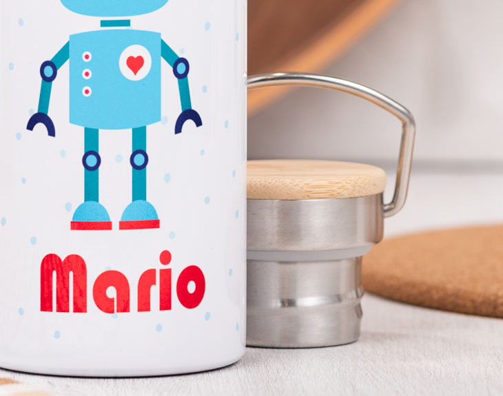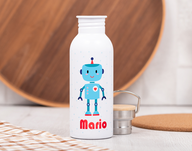 Los expertos recomiendan beber de dos a tres litros de agua al día para nuestro bienestar. Y ahora que, con la vuelta al cole, los niños pasan más tiempo fuera de casa, es normal que no beban toda la cantidad de agua suficiente. Pero… ¡Con esta botella personalizada esto se acabará! Conseguirás que tu hijo/a beba sus dos litros de agua al día. Si tu hijo/a ya está contando los días para volver a clase y quieres tener un detalle con él, esta botella es el regalo perfecto. Se convertirá en su aliada en todas sus aventuras diarias. Con una capacidad de 620 mililitros. Es ligera y fácil de transportar dado a su altura de 22,5cm, perfecta para que se la lleve al colegio, a las excursiones, actividades extraescolares o adonde quiera que vaya. Podrá disfrutar de su bebida favorita en cualquier lugar. Pero, sin duda, lo que más especial que tiene esta botella es que es personalizable. Tú nos dices el nombre que quieras y nosotros lo ponemos justo debajo del estampado del robot. ¡Le encantará! Para personalizarlo, lo primero es añadir el producto al carrito y entrar al área de personalización. Altura de la botella: 22,5 cm. Diámetro de la base de la botella: 7,3 cm. Capacidad: 620 ml. Material: Acero inoxidable.