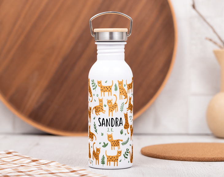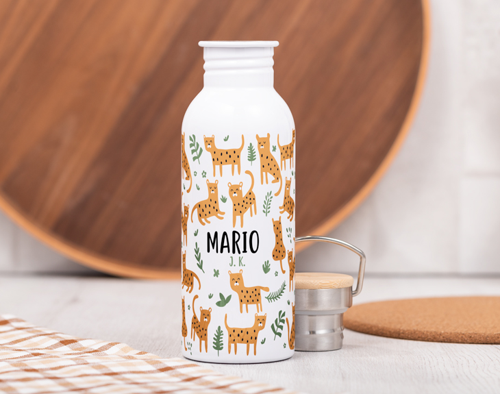 Si buscas una botella con la que poder perderte en una excursión o estás planeando un regalo práctico y bonito para una personita aventurera y divertida, te encantará contar con nuestra botella Forest personalizada Guepardos. ¡Tú escoges el texto que irá impreso sobre ella! Esta botella está fabricada en acero inoxidable y tiene una capacidad de casi un litro, por lo que es genial para llenarla una vez y despreocuparte. Lo mejor, es su diseño exterior y vintage, que la convierte en un modelo estilizado y elegante que encantará a todos. Su tapón, a rosca, tiene una argolla para poder sostener la botella más cómodamente y cuenta con una decoración hecha en madera de bambú que aporta ese toque natural al producto que tanto nos gusta. Lo mejor es su diseño, impreso sobre el fondo blanco de la botella. Nuestra preciosa colección de tiernos guepardos harán las delicias de niños y mayores y, en el centro, irá colocado el verdadero protagonista del regalo: ¡tu texto personalizado! Puedes diseñarla con el nombre del destinatario, una fecha importante o unas palabras bonitas. En el momento verás la vista previa y será el diseño que trasladaremos a tu regalo. Si se acerca el cumpleaños de tu mejor amigo, buscas una botella bonita para que tu hijo empiece el curso con ganas y energía o simplemente necesitas una botella para llevar a tu trabajo o a clase, este regalo original es la elección perfecta. ¡Seréis la envidia de todos! Un regalo tan práctico como único y del que te enamorarás a primera vista. Altura de la botella: 22,5 cm. Diámetro de la base de la botella: 7,3 cm. Capacidad: 620 ml. Material: Acero inoxidable.