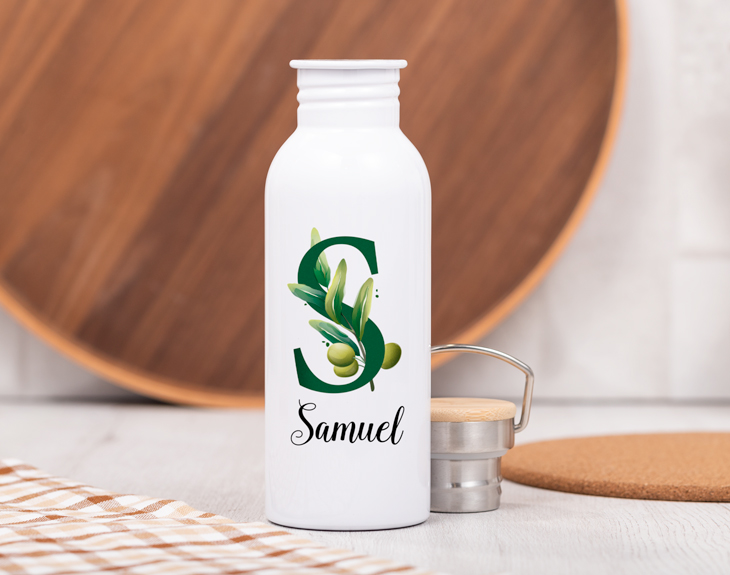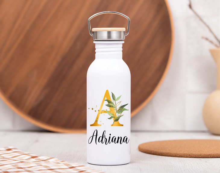 ¿Botellas reutilizables? ¡Por supuesto que sí! Ha llegado el momento de regalar la botella de agua personalizada más especial de todas. Y es que, además de ser respetuosa con el medio ambiente y mucho más saludable, tiene un diseño retro que enamorará allá donde vaya. ¿Lo mejor de todo? ¡La personalizaremos con su inicial y nombre! Se trata de una botella de acero inoxidable y con un tapón con detalles en bambú ideal para utilizar en el día a día. Podrás transportarla fácilmente y sin preocupaciones, ya que cuenta con un asa y un tapón de seguridad para evitar derrames. Sin duda, la mejor opción si estás buscando un regalo original y muy práctico. Además, nuestras letras botánicas en color dorado y con un diseño floral hará que se convierta en la botella más elegante de todas. Minimalista y con ese toque vintage que tan de moda está, ¡seguro que no sale de casa sin ella! Altura de la botella: 22,5 cm. Diámetro de la base de la botella: 7,3 cm. Capacidad: 620 ml. Material: Acero inoxidable.