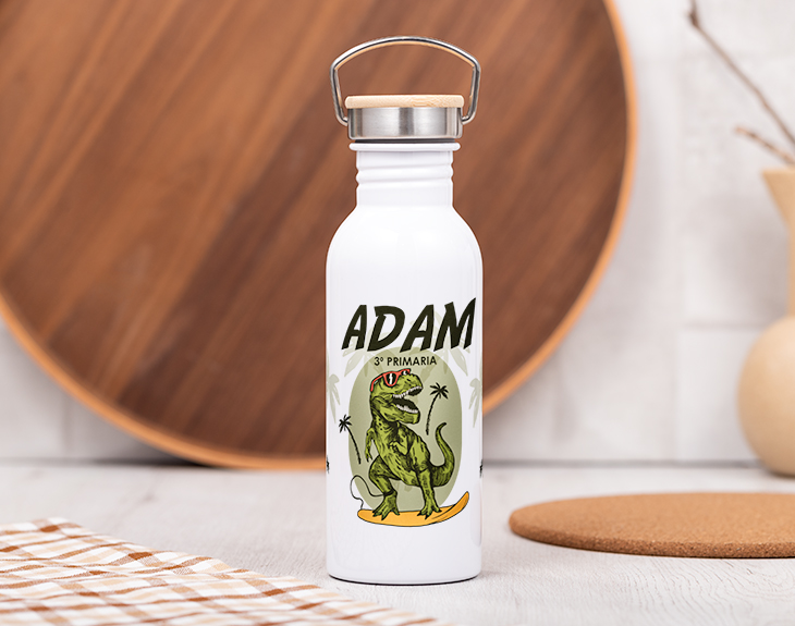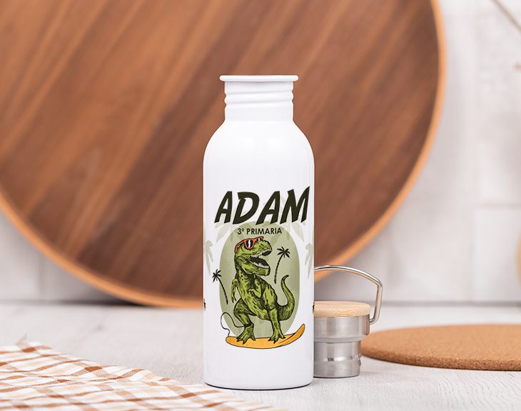 ¿No sabes que regalarle a tu peque? No dudes más y consigue la botella Forest personalizada con el dibujito de un Dinosaurio. Tu niño podrá cómodamente transportar su bebida favorita a cualquier lugar. Debido a su original diseño será la envidia de todos sus amigos. Además podrás incluir el nombre del afortunado. Despídete de tener que estar lavando a mano, ya que la botella está forjada en acero inoxidable. Tu peque tampoco necesitará estar yendo a rellenarla cada 10 minutos, ya que, cuenta con una capacidad de 750 mililitros. La podrá transportar fácilmente en su mochila o en la mano. Mide 27 centímetros. La botella incluye un tapón metálico con una anilla por si prefiere llevarla en la mano. El fondo de la botella es blanco con un dibujito de un dinosaurio surfeando la costa californiana, sobre él iría escrito el nombre, apellido o apodo. Bajo este se puede añadir en unas letras de inferior tamaño el curso o clase a la que pertenezca tu niño. Este regalo original le hará sentir especial siempre que vea su botella con su nombre puesto. ¡Será su botella favorita, le encantará! Altura de la botella: 22,5 cm. Diámetro de la base de la botella: 7,3 cm. Capacidad: 750 ml. Material: Acero inoxidable.