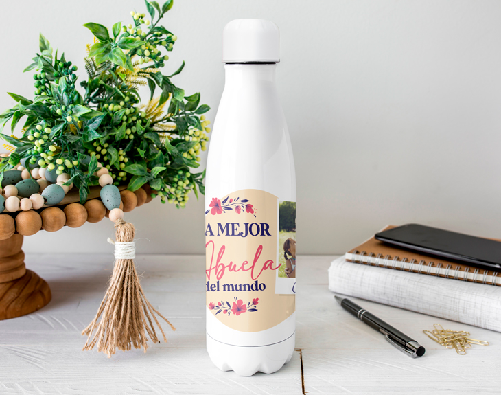 ¿Quién es la persona a la que podemos querer un poquito más que a nuestros padres? ¡Nuestra abuela, claro! Seguro que desde que eras pequeño, has compartido muchos momentos junto a ella. Te llevaba al parque, jugaba contigo, te buscaba a la salida del colegio... Por eso y mucho más, son las mejores del mundo. Sorpréndela con un regalo único y diferente como esta botella personalizada. Con ella, podrá mantenerse siempre bien hidratada y le encantará llevarla allá donde vaya. Seguro que te apetece agradecerle a tu abuela todo lo que ha hecho por ti y lo que sigue haciendo. En fechas especiales como el Día de la Madre o su cumpleaños, no hay mejor regalo que esta original botella reutilizable que podrá utilizar siempre que quiera. Podrás decirle que es la mejor abuela del mundo con este súper regalo. Esta botella está hecha de acero inoxidable, aguanta cualquier actividad y podrá mantener las bebidas frías o calientes durante mucho tiempo. ¡Le encantará! Llega el momento de personalizar esta botella. Añade el producto al carrito y comienza a diseñar tu botella. Elige si quieres la polaroid para poner tu foto favorita o solo texto. Una vez hecho esto, ya estará lista para entregar a la mejor abuela del mundo. Altura de la botella: 25,5 cm. Diámetro de la base de la botella: 6 cm. Capacidad: 500 ml. Material: Acero inoxidable.
