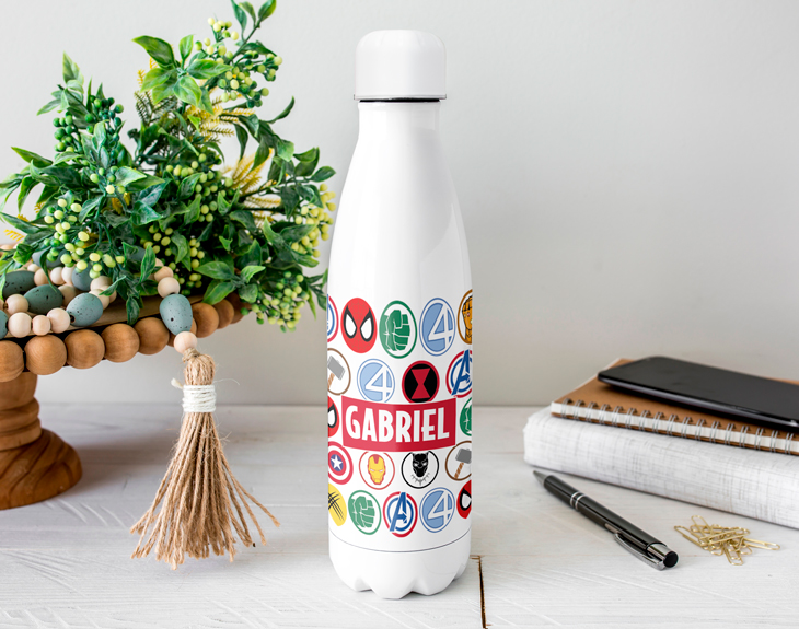 Pocas cosas molan más que ver las aventuras que viven tus superhéroes favoritos, ya sea en la gran pantalla o desde tu casa. Las películas de Marvel han creado héroes que todo el mundo conoce y que además nos encantan. Por eso, si eres un auténtico fan de los superhéroes necesitas esta súper botella Nature personalizada. Su diseño es todo un homenaje a los héroes más famosos del cine y estamos seguros de que esta botella te dará la energía y la fuerza necesaria para beber durante todo el día. ¡Es genial! Mantenernos hidratados es muy importante en nuestro día a día, por eso esta original botella es el accesorio perfecto para llevarlo allá donde vayas y tener tu agua o la bebida que quieras siempre a mano. Hecha de acero inoxidable, cuenta con doble pared para conseguir que la bebida se mantenga fría o caliente durante mucho tiempo. Además, cuenta con un tapón para evitar que se derrame el líquido de su interior y así poder transportarla cómodamente. ¡Es la mejor botella del mundo! Personalizando esta botella conseguirás sorprender a esa persona que es fan absoluta de los superhéroes. ¡Hacerlo es muy sencillo! Añade el producto al carrito y entra en el área de personalización. Nosotros te dejamos este diseño tan guay y tú solo tienes que escribir el nombre que quieras y colocarlo a tu gusto. Así de fácil es tener una botella tan guay como esta. ¡Será perfecta para acompañarte en tu día a día! Altura de la botella: 25,5 cm. Diámetro de la base de la botella: 6 cm. Capacidad: 500 ml. Material: Acero inoxidable de doble pared.