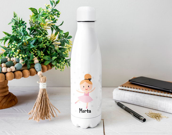 ¿Te encanta el mundo de la danza? ¿Tu hija adora sus clases de ballet? Si necesitas una sorpresa única para esa personita tan especial, con nuestra botella Nature personalizada Bailarina Ballet darás en el clavo. ¡Un práctico complemento para su día a día! Nuestras botellas nature están fabricadas en acero inoxidable y cuentan con un recubrimiento blanco ideal para que el diseño destaque a todo color.. Cuenta con un tapón de rosca muy fácil de usar, incluso para las manitas de los peques. Para el cuidado de la botella, recomendamos el lavado a mano, de manera que el recubrimiento exterior dure el máximo tiempo posible. Pero, sin duda, la parte que hace que esta botella destaque sobre las demás es la de su personalización. Este modelo se personaliza con una preciosa bailarina de ballet sobre un fondo de estrellas grises. En la parte inferior, irá colocado el nombre que nos digáis durante la fase de personalización e impreso en color negro, para que destaque bien. En la fase de diseño podrás ver la personalización directamente en pantalla, para que puedas hacerte una idea de cuál será el resultado. Hazte con este regalo tan original como práctico y descubrirás que es un misterio como has podido vivir hasta ahora sin ella. Puede acompañar a tu hija o hijo en sus clases (y gracias a tener su nombre nunca la perderá), usarla para ir al gimnasio o disponer de ella en sus excursiones. ¡No querrá separarse de ella! Altura de la botella: 25,5 cm. Diámetro de la base de la botella: 6 cm. Capacidad: 500 ml. Material: Acero inoxidable.