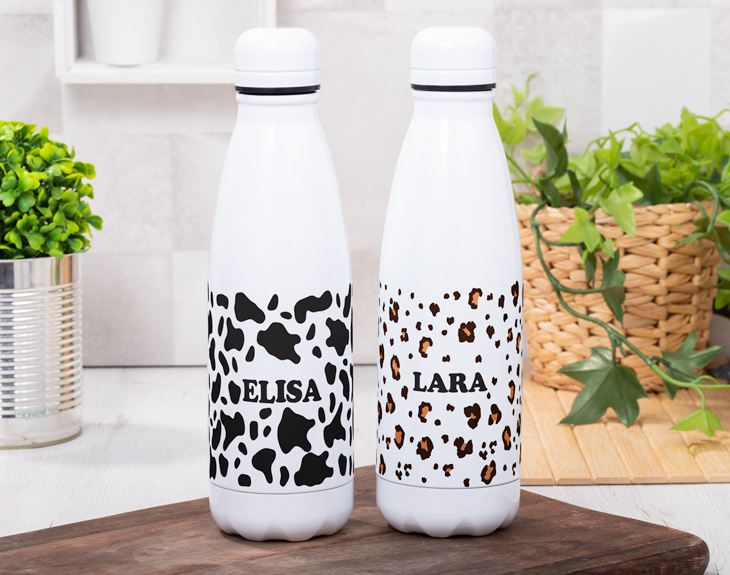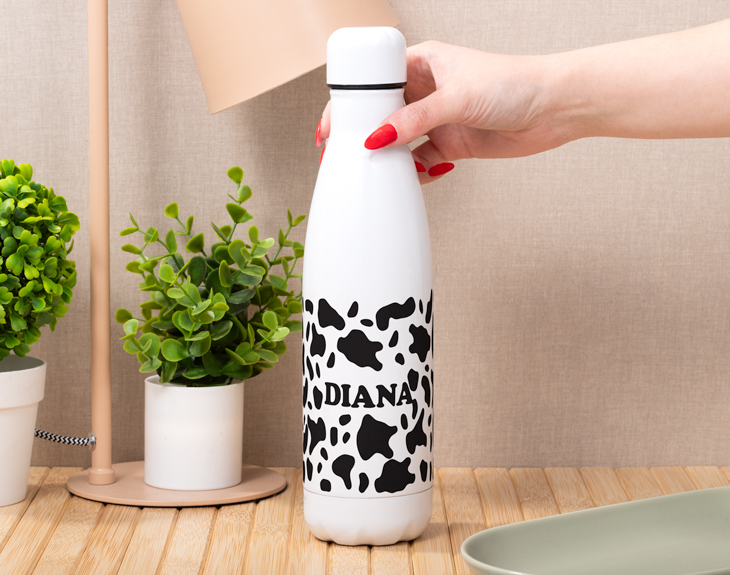 Saca tu lado más animal y gamberro con nuestra divertida botella Nature personalizada Animal Print. El gimnasio, el trabajo, las clases… Hay un montón de situaciones en las que necesitarás contar con una botella a mano, personalízala con tu nombre y llévala contigo a todas partes para tener siempre agua fresca cuando la necesites. Esta práctica botella personalizada es blanca de base, para que los colores del diseño queden mucho más resultones y llamativos. El tapón, por otro lado, es de tipo rosca y está fabricada en acero inoxidable. Su divertido diseño convierte esta botella en el centro de atención de cualquier mesa y, lo mejor es que podrás personalizarla con tu nombre. Para hacerlo, solo tendrás que elegir el estampado que más te guste (vaca, leopardo) y escribir el nombre que desees (o palabra) en el apartado de diseño de la plantilla. Nosotros nos encargaremos de imprimir ese diseño directamente sobre la superficie de la botella para hacer realidad tu personalización. Si se acerca el cumple de un ser querido y no sabes con qué sorprenderle ya, este regalo original seguro que le dejará sin palabras. No hay regalo más práctico que una botella que puedes usar en casi cualquier situación, y si su diseño es tan divertido y único como el de esta, ¡jamás se separará de ella! Altura de la botella: 25,5 cm. Diámetro de la base de la botella: 6 cm. Capacidad: 500 ml. Material: Acero inoxidable.
