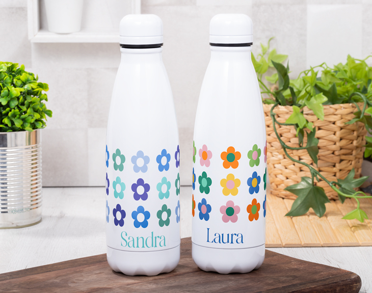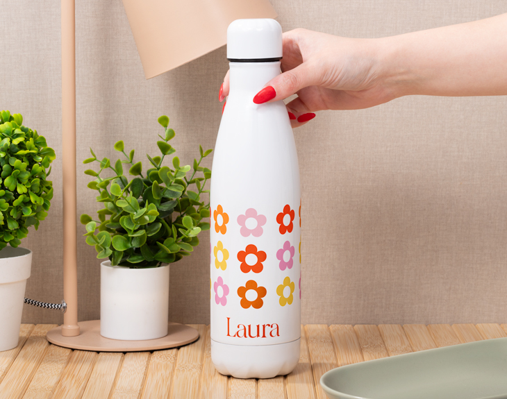 Ahora que llega el verano con el calor, mantenernos muy hidratados es súper importante para nuestra salud. Por eso, nuestra botella nature personalizada con diseño "Flores Groovy" es algo que no te puede faltar este verano. Es ideal para llevarla siempre contigo allá donde vayas. Lo mejor es que es personalizable, podrás escribir el nombre que tú quieras. Sin duda, esta botella nature se puede convertir en un original regalo para un cumpleaños, un amigo invisible o para cualquier ocasión especial. ¡Conseguirás que esa persona beba sus dos litros de agua al día! Gracias a su tamaño de 25,5cm x 6cm la podrás llevar en tu bolso o en la mochila sin ningún problema, y gracias a su capacidad de 500 ml podrás hacer frente a los efectos del calor. Fabricada en acero inoxidable, está preparada para mantener la temperatura en esos días calurosos. Solo tienes que añadirla al carrito y desde nuestro diseñador podrás añadir el nombre que quieras para hacer un regalo original y único. Altura de la botella: 25,5 cm. Diámetro de la base de la botella: 6 cm. Capacidad: 500 ml. Material: Acero inoxidable.