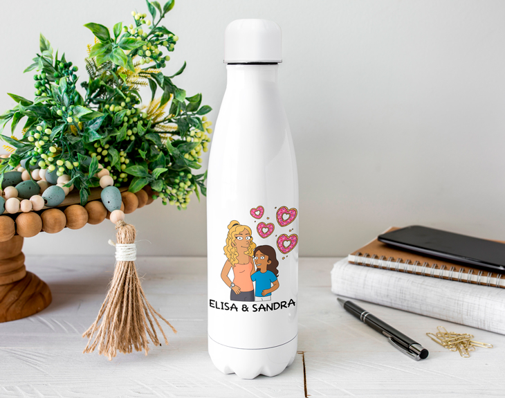 Después de las vacaciones toca volver a la rutina y puede hacerse muy pesado, especialmente para todas las madres del mundo. los días son largos y agotadores, por eso a mamá se le puede olvidar mantenerse hidratada y eso no puede ser. Por eso, si le regalas esta botella personalizada de doble pared le ayudarás a recordar lo importante que es beber agua en todo momento, porque con esta botella tan guay siempre tendrá ganas de hacerlo. ¡Es genial! Beber mucha agua y mantenernos siempre bien hidratados a lo largo del día, es algo que no podemos olvidar. Si quieres sorprender a mamá con un regalo único y muy divertido, hazte con esta original botella reutilizable que le robará el corazón. Podrá llevar agua o su bebida favorita a cualquier sitio y disfrutarla siempre que quiera. Y lo mejor de todo es su diseño, en el que vosotros mismos seréis los protagonistas, pero convertidos en auténticos dibujos animados. ¡Quedará súper guay! ¿Cómo puedes personalizar esta botella tan chula? Lo primero que hay que hacer es añadir el producto al carrito y entrar al área de personalización. Ahí, podrás elegir el color que más te guste para la botella y después empezar a crear vuestros personajes con todos los detalles que necesites para que sean igualitos que vosotros. Por último, elige el fondo y escribe vuestros nombres y listo. Nosotros no encargamos de lo demás. ¡Todos querrán tener una igual! Altura de la botella: 25,5 cm. Diámetro de la base de la botella: 6 cm. Capacidad: 620 ml. Material: Acero inoxidable de doble pared.