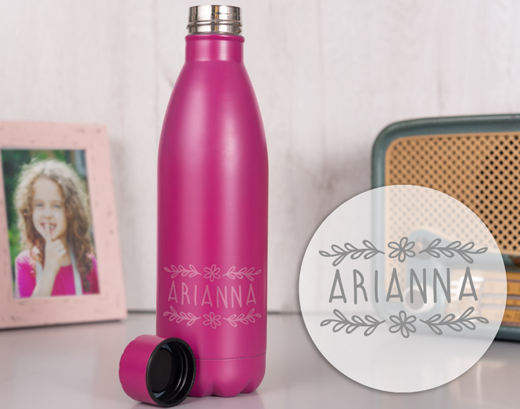 Sorprender a quien queremos es muy fácil cuando optamos por regalos personalizados. El hecho de que sean únicos para cada persona, les da un plus que pocos regalos similares pueden conseguir. Si buscas tener un detalle exclusivo y práctico con un ser querido, no dudes en que nuestra botella Nature personalizada Flores te sacará de cualquier apuro. Esta preciosa botella se personaliza con el nombre de la persona destinataria rodeado por dos cenefas florales. Para diseñarla, el proceso es la mar de sencillo. Solo tienes que acceder a la plantilla y anotar sobre el símbolo + el nombre de la persona a sorprender. En el momento puedes ver cómo será el resultado que grabaremos a láser en la parte inferior de la botella. Por otro lado, también podrás escoger el color de botella que más te guste durante la gestión del pedido. Todas las botellas Nature son ligeras y están fabricadas en acero inoxidable, por lo que serán perfectas para llevarlas siempre contigo. Además, cuentan con un cierre tipo rosca. Al ser metálicas, retienen muy bien el frío del contenido y durante mucho más tiempo que otro tipo de botellas de plástico o cristal. Si se acerca el cumpleaños de un familiar o amigo al que quieres sorprender con un detalle especial, esta botella te ayudará a dejar un recuerdo imborrable. Seguro que le sacará un montón de partido a este regalo original yendo con ella al gimnasio, al trabajo o a clases. Es un detalle de lo más práctico y que, cada vez que use, le recordará a ti. Altura de la botella: 25 cm. Capacidad: 790 ml. Material: Acero inoxidable.