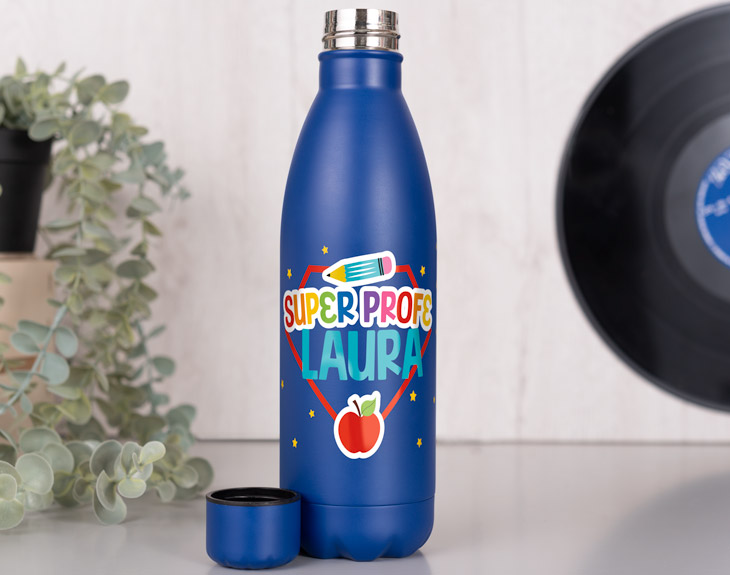 Seguro que alguna vez has pensado que tu profe parece un superhéroe por todas las cosas que es capaz de hacer durante todo el curso. Sus mejores superpoderes son tener una paciencia infinita, unos conocimientos increíbles, mucha vocación y una dedicación extrema a enseñar. Ahora es el momento de devolverle a vuestro profe todo lo que os ha enseñado durante este año con un regalo único: ¡nuestra botella personalizada Nature de colores! A partir de ahora beber agua será mucho más guay con esta preciosa botella y su diseño especial para todo los profes. ¡No se despegarán de ella ni un segundo! Es importante que cualquier profe se mantenga hidratado siempre que pueda porque se pasan horas y horas hablando sin parar. Por eso, vuestro profe favorito necesita tener esta original botella para poder usarla todos los días. Es genial porque además de ser muy guay, se puede reutilizar y así reducimos el uso de plástico. Pero si quieres personalizar por completo esta botella, podrás elegir de qué color la quieres, pensando en cuál es el color favorito de tu profe. ¡Se quedará sin palabras! Pero antes de entregarle este regalo al profe, tendrás que personalizar esta botella. ¡Es muy sencillo! Añade el producto al carrito y entra en el área de personalización. Primero elige el color que más te guste (rosa, azul, verde, rojo o negro) y después completa este diseño con el nombre de tu profe. ¡Así de fácil es crear la botella más guay para tu profe favorito! Altura de la botella: 25 cm. Capacidad: 790 ml. Material: Acero inoxidable.