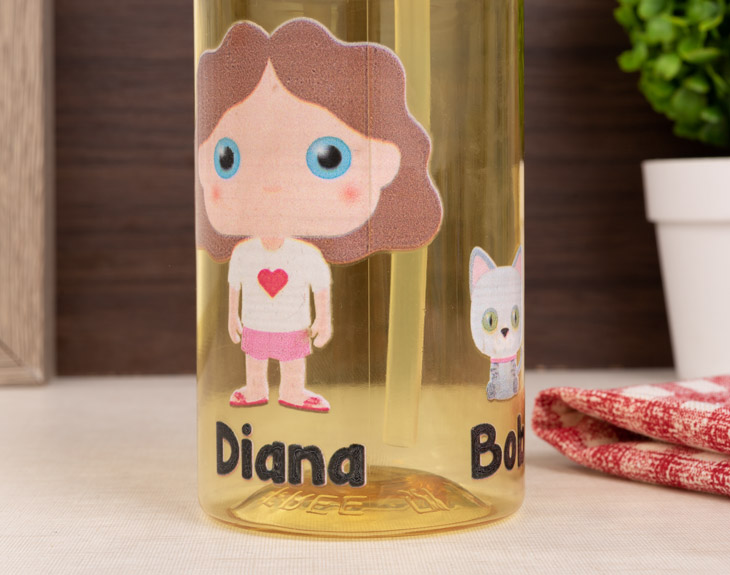 • Botella con pajita personalizada. • Tarjeta Recordatoria.