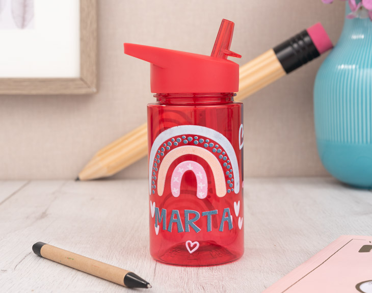 Los días de cole pueden llegar a ser durísimos para el/la pequeño/a de la casa. ¿Por qué no hacer que esa rutina tenga un poquito más de color gracias a un producto tan bonito como útil? Esta botella con pajita personalizada será su mejor compañero a lo largo de la semana. ¡Una botella con pajita de plástico con la que podrá beber todo el agua que quiera! Si quieres que todos los días tu hijo/a tenga toda la energía del mundo, seguro que esta botella de color con pajita y diseño de arcoíris será el regalo que estabas buscando. Su altura de 16 centímetros hace que tenga el tamaño perfecto para llevarlo en la mano o en la mochila. ¡Podrás escoger entre los tres colores disponibles! Amarillo, rojo o azul... ¡Escoge el que más te guste! La botella cuenta con un mecanismo para guardar y sacar la pajita, por la que podrá sorber todo el agua que quiera. ¡Es el mejor regalo original para la rutina escolar! Además, podrás personalizar el producto con el color y el nombre que quieras en el diseño. Escoge la botella que más te guste y entra en el área de personalización para crear el diseño que quieras, haciendo clic sobre el cuadro de texto. ¡Será el regalo más bonito! Altura de la botella: 16 cm. Capacidad: 400 ml. Colores: Amarillo, rojo o azul. Material: Plástico.
