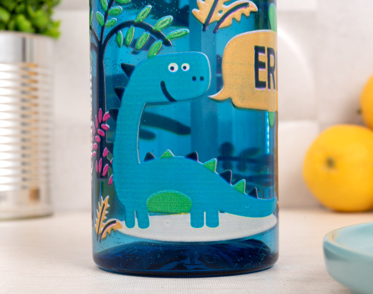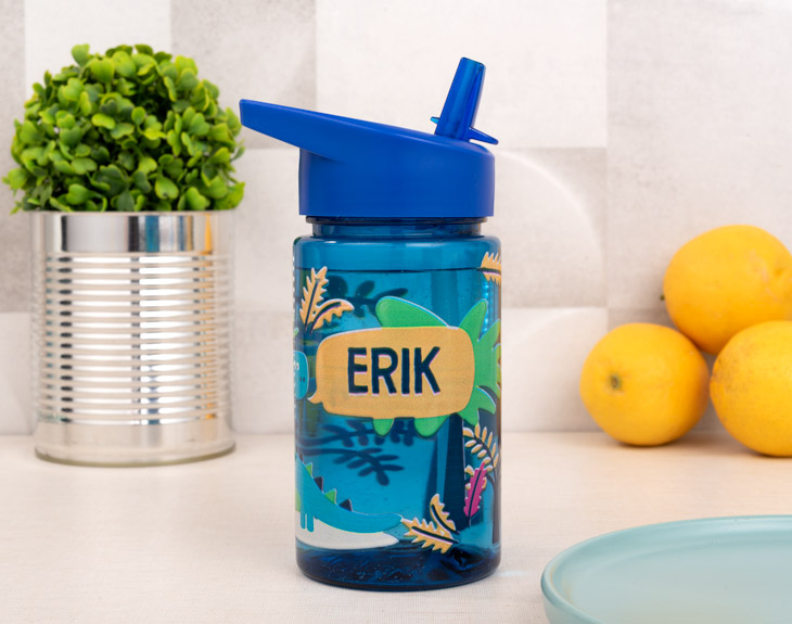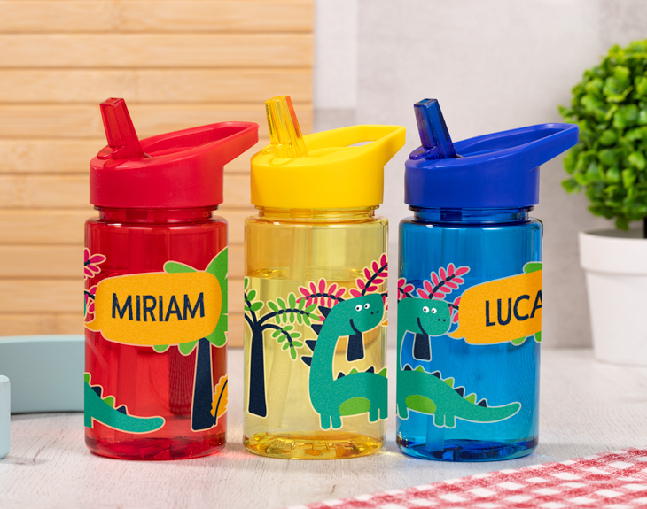 Los peques de la casa tienen que tener la fuerza de un dinosaurio para afrontar todos los retos del día a día, ¿y por qué no hacerlo de una forma original? Conseguirás que tus hijos se hidraten en cualquier ocasión gracias a esta botella con pajita personalizada, pensada para degustar su bebida favorita cuando más falta les hace. ¡Es muy resistente y cuenta con pajita incorporada! ¿Cuántas veces te han pedido agua tus hijos al salir del colegio? Esta botella de color con pajita y diseño de dinosaurio será la clave para que no estén sedientos durante las horas de clase. ¡La podrán llevar todos los días! Debido a su tamaño y capacidad (16 centímetros y 400 mililitros, respectivamente), este producto es perfecto para llevarlo en la mochila. La pajita cuenta con un mecanismo para abrirla y cerrarla dependiendo del gusto o necesidad. ¡Y cuenta con tres colores distintos entre los que escoger! Si a tu hijo/a le encantan los dinosaurios y está ansioso por convertirse en paleontólogo, este regalo original está hecho para él. ¡Le sacará una sonrisa en cualquier momento de su rutina! En el área de personalización tendrás que elegir el color de la botella. Una vez escogido podrás personalizar este diseño con su nombre o el texto que quieras, gracias a la plantilla que encontrarás en el diseñador. ¡Clica sobre el cuadro de texto para personalizar este diseño tan colorido! Altura de la botella: 16 cm. Capacidad: 400 ml. Colores: Amarillo, rojo o azul. Material: Plástico.