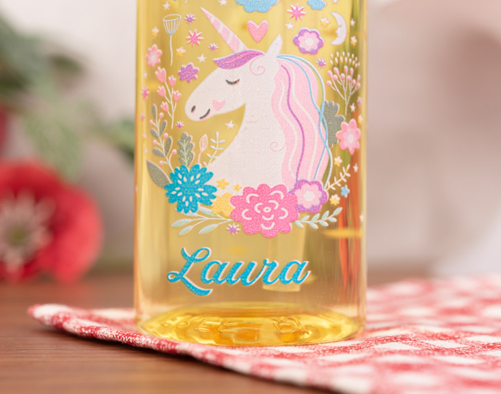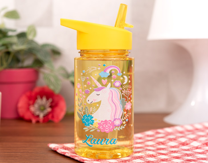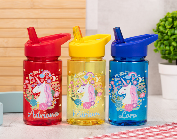 ¿Los días de cole terminan haciéndose durísimos para los más peques? Tu hijo/a necesita toda la hidratación posible, por lo que esta botella con pajita personalizada le hará ver su día a día de color de rosa. ¡Un unicornio le acompañará en todo momento gracias a esta botella con pajita! No habrá un mejor regalo para la más pequeña de la casa que una botella de color con pajita y diseño de unicornio como esta. Si le encanta la fantasía, seguro que le flipa este detalle. Existen tres opciones de color: amarillo, rojo o azul. Esta botella es lo suficientemente resistente para aguantar el día a día, con una altura de 16 centímetros y 400 mililitros de capacidad. ¡No tendrá ningún problema para disfrutar de su bebida favorita! ¿Qué mejor forma de sorprender a tu pequeño/a que con un regalo original tan fantástico y colorido como este? ¡El unicornio podrá ir impreso en el lomo de la botella junto con su nombre! En el área de personalización podrás escribir el nombre que quieras, creando el diseño más bonito para él o ella. ¡Clica sobre el cuadro de texto para escribir el texto que quieras! Altura de la botella: 16 cm. Capacidad: 400 ml. Colores: Amarillo, rojo o azul. Material: Plástico.