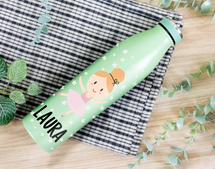 Necesitamos beber dos litros de agua al día como nos dicen los expertos. Y como sabemos que a veces puede costar un poco beber agua y mantenernos hidratados, con nuestra botella XL personalizado ya no se te olvidará beber a lo largo del día. Esta preciosa botella es perfecta para tenerla llena de agua y mantenerte súper hidratado durante los largos días que pasas tanto fuera como dentro de casa. Además, es el regalo perfecto para cualquier persona. Pero esta botella es muy especial, y eso es por su peculiar y adorable diseño. Una pequeña bailarina rodeada de estrellas que decora el lomo de esta original botella de acero inoxidable con colores pastel. Este producto es perfecto para darte un pequeño capricho pero también para regalar, porque es la mejor botella que alguien puede recibir. Ideal para llevarla a cualquier sitio, porque gracias a sus materiales mantiene tus bebidas tanto frías como calientes. ¡Tiene el tamaño perfecto para transportarla! Pero para mantenerte siempre hidratado de una forma elegante y diferente, tendrás que personalizar esta botella. Hacerlo es muy fácil. Solo tienes que escribir el nombre que quieras que aparezca en la botella junto a esta bailarina. Del resto nos encargamos nosotros. Además, podrás elegir el color de botella que quieres: verde o azul. ¡El mejor regalo para cualquier celebración! La botella cuenta con doble pared y aislamiento de cobre al vacío. Esto quiere decir que tus bebidas podrán mantenerse frías o calientes durante más tiempo, conservando su temperatura original. Altura de la botella: 28 cm. Diámetro de la base: 6,5 cm. Capacidad: 750 ml. Colores disponibles: verde o azul. Material: acero inoxidable.