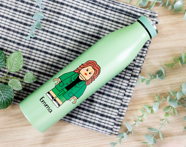 ¿Sabes cuántos litros de agua tienes que beber al cabo del día? Los expertos recomiendan beber alrededor de dos litros de agua para tener toda la energía que necesitamos para hacerle frente al día a día. Para eso necesitamos un recipiente que podamos llevar a todas partes, un objeto que nos acompañe en nuestra rutina cada vez que tengamos que recuperar el aliento. ¡Para eso contamos con la botella XL personalizada! Y es que esta botella de acero inoxidable con colores pastel no es como cualquier otra botella que puedas tener por casa. Además de contar con colores de lo más cuquis y bonitos, esta botella es de tamaño XL, con una altura de 28 centímetros y una capacidad de 750 mililitros. ¡Te cabrá una buena cantidad de tu bebida favorita! Para ponerle punto y final a este regalo original tenemos un hueco hecho para la familia más cuadriculada: ¡La familia Lego! Podremos plasmar el personaje Lego que quieras en el lomo de la botella. Podrás escoger uno de los personajes predeterminados de la familia o crear una figurita desde cero, hecha con todos esos detalles que hacen que esa persona sea como es. ¡Un detalle que nunca podrá olvidar! La botella cuenta con doble pared y aislamiento de cobre al vacío. Esto quiere decir que tus bebidas podrán mantenerse frías o calientes durante más tiempo, conservando su temperatura original. Altura de la botella: 28 cm. Diámetro de la base: 6,5 cm. Capacidad: 750 ml. Colores disponibles: verde o azul. Material: Acero inoxidable.