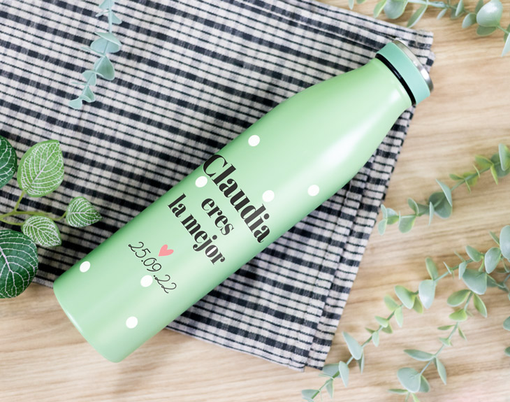 En todas las celebraciones y eventos siempre deberíamos regalar cosas que sean de gran utilidad. ¿Qué mejor que sorprender a una persona a la que quieres mucho con algo que le pueda ser de mucha ayuda en su día a día? No se nos ocurre una mejor forma de hacerlo que con esta botella XL personalizada. ¡Podrá tomar sus dos litros de agua diarios gracias a este productazo! Esta botella de acero inoxidable con colores pastel viene con un diseño con el que celebrar lo bonita que es la vida en todo momento. Gracias a su enorme tamaño (28 centímetros de alto y 750 mililitros de capacidad), cualquier persona podrá disfrutar de su bebida favorita en el lugar que quiera. Y si quieres hacer que este regalo original sea todavía más único y particular, podrás incluir la dedicatoria que quieras al diseño. Añade el producto al carrito y accede al diseñador de la web, donde encontrarás el diseño de la botella para personalizar con la información que quieras. ¡Clica en el cuadro de texto y dale un toque personal a este regalazo! La botella cuenta con doble pared y aislamiento de cobre al vacío. Esto quiere decir que tus bebidas podrán mantenerse frías o calientes durante más tiempo, conservando su temperatura original. Altura de la botella: 28 cm. Diámetro de la base: 6,5 cm. Capacidad: 750 ml. Colores disponibles: verde o azul. Material: Acero inoxidable.