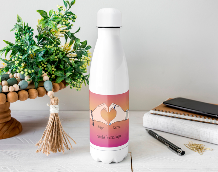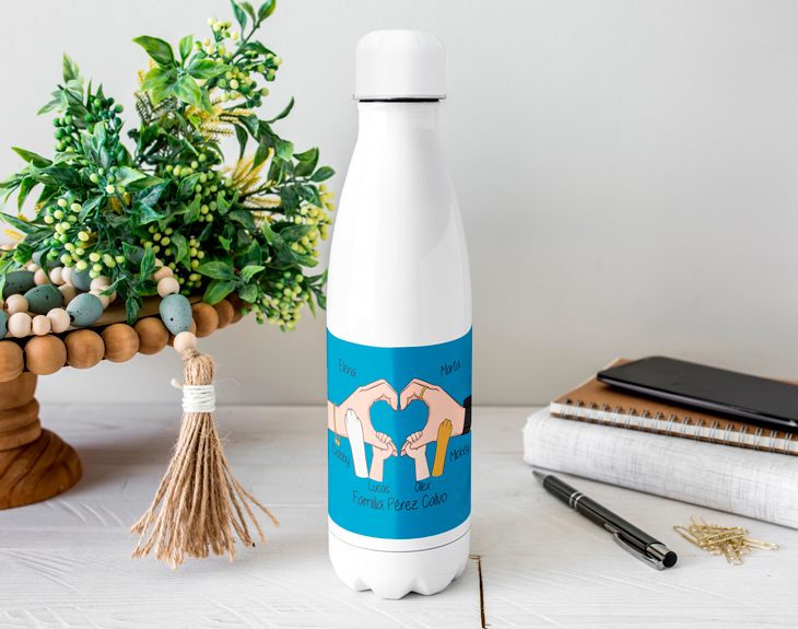 Las familias unidas molan un montón. Padres, hijos y hasta mascotas pasando tiempo juntos y haciendo miles de planes, porque les encanta estar unidos. Si sois de esas familias que no paran de hacer cosas juntos, de aquí para allá, necesitáis esta botella personalizada para que os acompañe en todas vuestras aventuras. Seguro que a lo largo del día hacéis muchas cosas tanto juntos como separados, y por eso tenéis que manteneros siempre hidratados. Con esta botella nunca os faltará agua ni vuestra bebida favorita. Pero lo mejor es su diseño, unas preciosas manos formando un corazón que representará a la perfección a vuestra familia y que podéis personalizar a vuestro gusto. Esta original botella es el regalo perfecto para cualquier miembro de la familia en ocasiones especiales como cumpleaños, días del padre o de la madre, amigos invisibles... Hecha de acero inoxidable, es muy resistente y perfecta para mantener tu bebida siempre disponible. ¡Vayas donde vayas, necesitas llevar esta botella! Podrás personalizar tu propia botella y crear tu diseño desde cero. ¡Es muy sencillo! Añade el producto al carrito y ahí podrás acceder al apartado para diseñar tus manos a tu gusto. Añade todos los detalles necesarios para que se parezcan a tu familia. Además, podrás añadir los nombres de todos los miembros en la parte inferior del diseño. ¡La mejor botella del mundo! Importante: Podrás crear el diseño desde cero, eligiendo todos los detalles necesarios (color de la piel, accesorios para las manos, mezclar manos con patitas de gato o perro, pintar las uñas). Altura de la botella: 25,5 cm. Diámetro de la base de la botella: 6 cm. Capacidad: 500 ml. Material: Acero inoxidable.