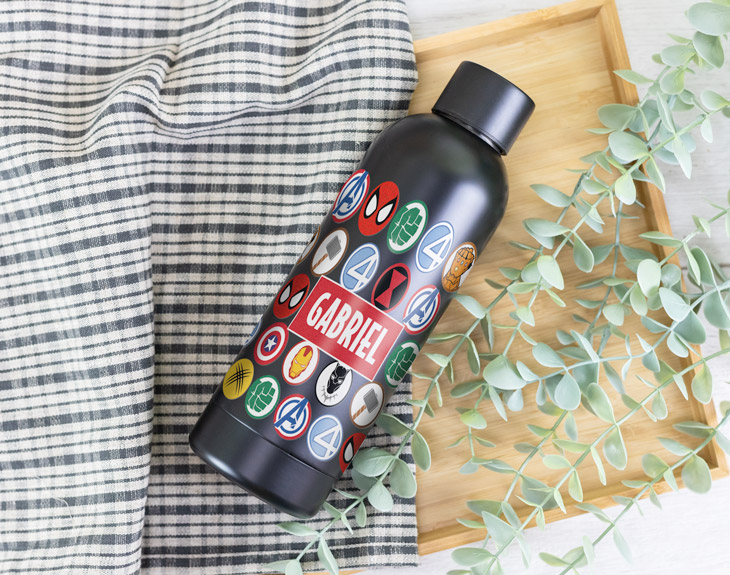 Las películas de superhéroes son las mejores porque tienen de todo: acción, drama, comedia... Si tienes todo el merchandising de tus héroes favoritos, nuestra botella VIP personalizada te va a encantar y va a ser toda una necesidad en tu día a día. Su diseño es perfecto para los auténticos fanáticos del universo Marvel, que disfrutan de las aventuras de superhéroes contra villanos. ¡Será el mejor regalo del mundo! Hidratarse y beber mucha agua todos los días es muy importante. Por eso, necesitas esta original botella para tener agua o tu bebida favorita siempre a mano. Hecha de acero inoxidable, es ideal para mantener tu bebida fría o caliente durante mucho tiempo. Además, cuenta con un tapón para poder transportar cualquier bebida y evitar que se derrame el líquido que hay dentro. Pero para tener tu botella a medida, elige el color que más te guste: negro, rosa, azul o dorado. ¡Hay para todos los gustos! Sorprende a esa persona tan especial y fan de Marvel personalizar esta botella. Primero, elige el color que más te guste y después escribe el nombre que quieras en el espacio vacío. Podrás ajustarlo para que quede perfecto y visualizar cómo quedará el diseño al completo. Una vez hayas terminado, podrás finalizar la compra y recibir esta súper botella. ¡Todo el mundo querrá una igual! Altura de la botella: 22 cm. Diámetro de la base: 6,5 cm. Capacidad: 550 ml. Colores disponibles: rosa, dorada, azul y negro. Material: Acero inoxidable.