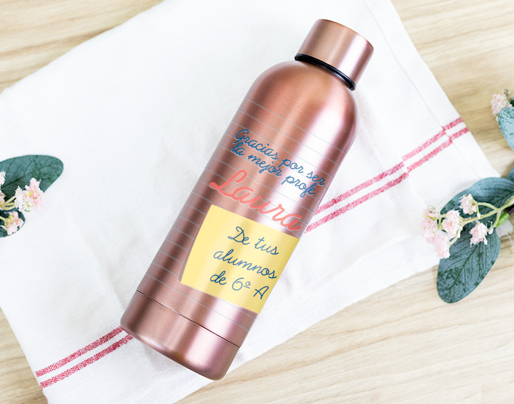 Si habéis conseguido llegar a fin de curso con unas notas excelentes, es gracias a vuestro esfuerzo y al trabajo de vuestro profe. Que sea el mejor merece un agradecimiento único, como nuestra botella VIP personalizada. Este diseño es perfecto para todos los profes, porque estamos seguros de que les encantará tener una botella personalizada tan guay como esta. ¡Seréis los mejores alumnos del mundo! Sabemos que este año ha sido divertido pero también agotador. Y es que no hay nada que tu profe necesita más que esta original botella de acero inoxidable con diseño de profes. Con ella podrá mantenerse hidratado siempre que lo necesite, porque esta elegante botella es reutilizable y gracias a ella podrá reducir el uso de plásticos. Además, gracias a su material y doble pared con aislamiento, las bebidas se mantendrán frías o calientes durante mucho tiempo. Es la botella ideal para llevarla de aquí para allá y beber en todo momento. ¡A vuestro profe le encantará! No puedes olvidarte de personalizar esta botella para tu profe. Añade el producto al carrito y entra en el área de personalización. Ahí podrás elegir el color de la botella y completar esta página de cuaderno con el texto que quieras. Escribe el nombre y dedicatoria para tu profe, colócalo y listo. ¡Será el regalo perfecto para el último día de curso! La botella cuenta con doble pared y aislamiento de cobre al vacío. Esto quiere decir que tus bebidas podrán mantenerse frías o calientes durante más tiempo, conservando su temperatura original. Altura de la botella: 22 cm. Diámetro de la base: 6,5 cm. Capacidad: 550 ml. Colores disponibles: rosa, dorado, azul y negro. Material: Acero inoxidable.
