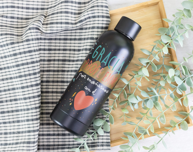 Un profe enseña mucho mejor cuando ha nacido para esto. ¡Hay que dar clases poniendo todo el corazón! Esta botella vip personalizado le vendrá de lujo cuando tenga que hidratarse a lo largo de una clase o para los descansos entre materias. ¡La botella más elegante para el mejor profesor que tus hijos han podido tener este año! Esta botella de acero inoxidable con diseño de profes será la mejor forma de agradecerle todo lo que ha hecho por tu hijo/a a lo largo de estos meses de curso. La botella cuenta con una capacidad de 500 mililitros y una altura de 22 centímetros, por lo que podrá llenarla con su bebida favorita y disfrutarla a lo largo de la mañana. Cuenta con cuatro colores metálicos disponibles: rosa, dorado, azul o negro. ¡Escoge la que más te guste con el diseño correspondiente! Además de ser un detalle de lo más lujoso, este regalo original para fin de curso le será de gran utilidad cuando más necesite un trago de agua. El diseño está hecho específicamente para darle las gracias por todo su trabajo durante el curso. Encontrarás la plantilla de la botella en el área de personalización, una vez hayas añadido el producto al carrito. ¡Clica sobre el cuadro de texto para escribir el nombre del mejor profe! La botella cuenta con doble pared y aislamiento de cobre al vacío. Esto quiere decir que tus bebidas podrán mantenerse frías o calientes durante más tiempo, conservando su temperatura original. Altura de la botella: 22 cm. Diámetro de la base: 6,5 cm. Capacidad: 550 ml. Colores disponibles: rosa, dorado, azul y negro. Material: Acero inoxidable.