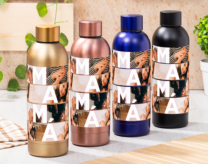 Que las madres son lo mejor del mundo, eso lo sabe todo el mundo. Y prueba de ello son los múltiples momentos que vivimos con ellas. Esos momentos, si están plasmados en imágenes, es más fácil y tierno que perduren en nuestra memoria y revivirlos siempre que queramos. ¡Qué mejor manera de recordárselos que cada vez que utilice esta botella vip personalizada con impresión 360º a color! Es importante vivir y beber, vaya, estar hidratadas. Y para nuestras madres queremos siempre lo mejor. Así que podrá hidratarse y tener presentes sus mejores momentos como madre a la vez que se cuida y se hidrata. En apenas un minuto, puedes diseñar un regalo original tan bonito como útil: la botella de más de medio litro viene reforzada con una doble pared y aislamiento de cobre al vacío que conserva la temperatura. Esta original botella puede personalizarse con fotos entremezcladas con las letras que forman la palabra MAMÁ. Así, al poder personalizarla con las fotos que elijas, además de útil también entregarás un regalo muy original y que nadie más tendrá en su trabajo, su gym, sus excursiones, etc. ¡Crea un bonito collage de recuerdos al alcance de su mano! Altura de la botella: 22 cm. Diámetro de la base: 6,5 cm. Capacidad: 550 ml. Colores disponibles: rosa, dorado, azul y negro. Material: Acero inoxidable.