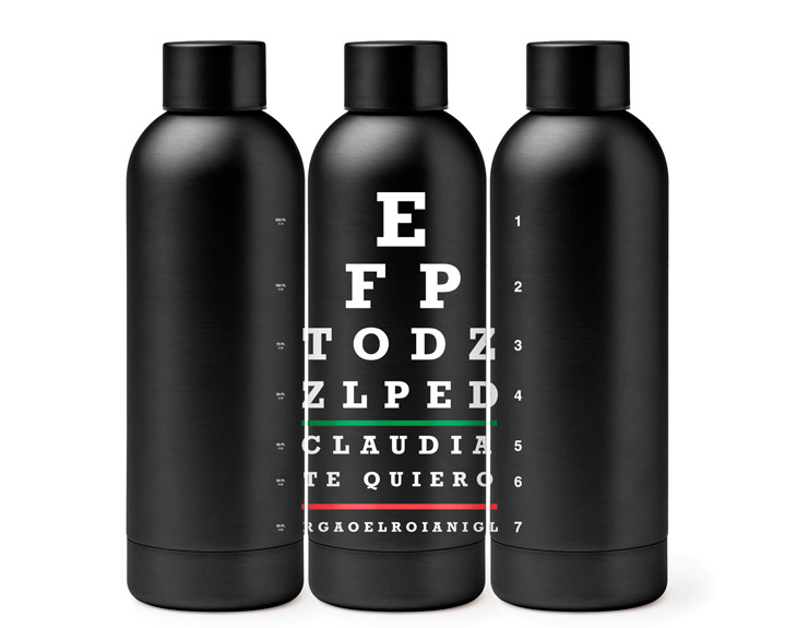 Todos hemos pasado alguna vez por un test visual, ¿verdad? Ese panel lleno de letras de mayor a menor tamaño en el que sufríamos cuando el oculista nos preguntaba si veíamos las letras o no. Todos hemos pasado alguna vez por esta experiencia y si se te quedó marcada para toda la vida, te parecerá una idea súper diferente, podrás tener este panel impreso en nuestra botella vip personalizada. Será el accesorio que no te puede faltar en tu día a día porque tiene un diseño de lo más divertido. Tener un diseño tan conocido seguro que le saca una sonrisa a persona que reciba esta original botella de acero inoxidable porque además de ser responsable con el medio ambiente es muy práctica para llevarla donde quieras. Gracias a sus materiales, podrá mantener tu bebida favorita tanto fría como caliente durante varias horas, para que nunca te deshidrates. ¡Es el mejor regalo del mundo! Esta preciosa y divertida botella con colores metálicos tiene unas medidas de 22 centímetros de alto y cuenta con una capacidad de 550 mililitros. Lo único que tienes que hacer para que sea un regalo único, es personalizar este producto. Podrás añadir el mensaje que tú quieras, bien escrito o para que la persona que lo reciba tenga que descifrarlo. ¡Le encantará esta botella! La botella cuenta con doble pared y aislamiento de cobre al vacío. Esto quiere decir que tus bebidas podrán mantenerse frías o calientes durante más tiempo, conservando su temperatura original. Altura de la botella: 22 cm. Diámetro de la base: 6,5 cm. Capacidad: 550 ml. Colores disponibles: rosa, dorado, azul y negro. Material: Acero inoxidable.
