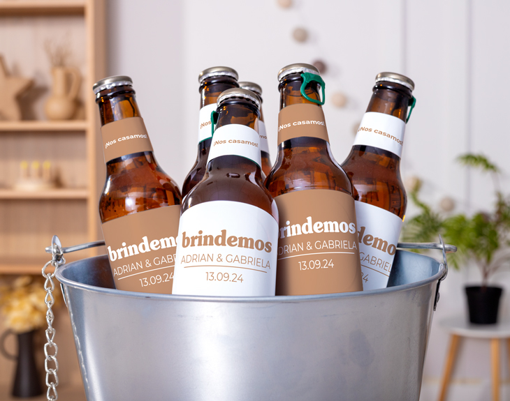 ¡Llegó el momento de brindar por vuestro amor por todo lo alto! Nuestro botellín de cerveza personalizado es el detalle perfecto para sorprender a vuestros invitados en el día más especial. Y es que, no se nos ocurre una manera más original de compartir un brindis inolvidable con vuestras personas favoritas. Sin duda, un recuerdo único y cargado de amor que todo el mundo recordará. Si queréis que vuestra boda sea una experiencia muy especial para todos vuestros familiares y amigos, esta opción es fantástica. ¡será un dos por uno! Por un lado, podréis servirlas en el cóctel dándole un toque muy personal y emotivo, y, por otro lado, será un detalle increíble para que se lo lleven a casa. ¿Te imaginas las caras que pondrán al verlo? ¡Les parecerá un detallazo increíble! Para personalizarlo, solamente tenéis que escribir el texto que queráis en nuestro diseñador, además, podréis ver en todo momento una previsualización para saber cómo será el resultado final. Además, gracias a nuestro selector de cantidad podréis escoger el número de botellines que queráis. A medida que aumentéis el número se irá actualizando el precio para que podáis saber cuál será el total antes de llegar al último paso.