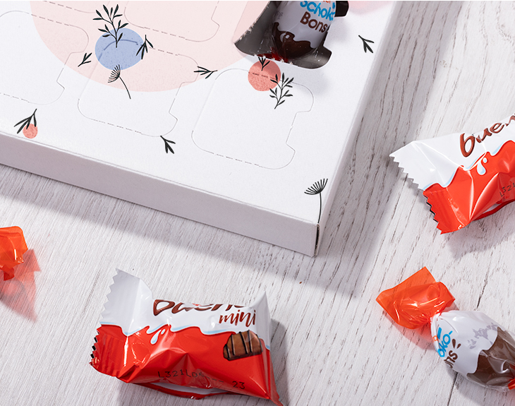 • Caja de 25 Kinder personalizado. • Mix de chocolatinas Kinder. • Tarjeta Recordatoria.