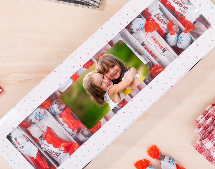 ¿A quién no le gustan los chocolates Kinder? Sin duda, la marca italiana es una de las favoritas para pequeños y mayores, por eso, esta caja de Kinder con foto es una increíble opción de regalo. Solo tienes que buscar en el baúl de los recuerdos y seleccionar una foto que le transporte a un bonito momento juntos y será el mejor regalo que haya recibido nunca. ¡Es el momento de tener un detalle con esa persona tan especial! Hemos escogido las chocolatinas más icónicas de la marca italiana para hacer este producto. Incluye así: Kinder Bueno Mini, Schokobons y Kinder Chocolate Maxi. Está disponible en dos formatos: - Caja de Kinder: 29 x 11,5 x 3 cm. Incluye 24 chocolatinas. - Caja de Kinder XL: 43 x 11,5 x 3 cm. Incluye 36 chocolatinas.