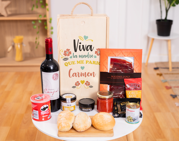 ¿Cuántas veces se ha sacrificado tu madre por ti? Desde el momento en el que te dio a luz, la mujer más importante de tu vida no ha parado de anteponer tu bienestar al de cualquier persona. La cantidad de ocasiones en las que mamá se ha convertido en toda una heroína no se pueden contar con los dedos de una mano. Por esto se debe celebrar el Día de la Madre. Una vez al año, hay que agradecer a nuestras madres todo lo que han hecho por nosotros a lo largo de su vida. ¿Y acaso hay una manera mejor de demostrárselo que con comida? Nosotros creemos que no, por lo que una caja de aperitivo personalizada como esta parece el regalo perfecto para la madre que te parió. Dentro de esta caja de madera (cuyas medidas son 37,5x20,5x10cm) encontraréis un surtido de los mejores productos gastronómicos salados, para preparar un aperitivo con el que os chuparéis los dedos. Aceitunas, jamón, tomate triturado... ¡todo lo necesario para pasar un Día de la Madre de lo más salado! Además, podrás personalizar esta caja de madera con asa con el nombre de mamá, para que se convierta en un detalle emocionante. Dimensiones de la caja: 37x20x10 cm Dimensiones de la tapa deslizante: 36,5x19cm Utilizamos como base un exquisito vino de la Tierra de Castilla y León, cuya Certificación de Origen asegura que es un producto de una calidad excepcional. Envejecido en barrica de roble, estamos ante un caldo sorprendente y lleno de matices, cuya botella premium y su elaborado sabor hacen de él el mejor regalo posible. Importante: la caja de madera trae de serie un pequeño círculo superior centrado para abrir cómodamente la caja donde recomendamos no diseñar cosas importantes de la personalización.
