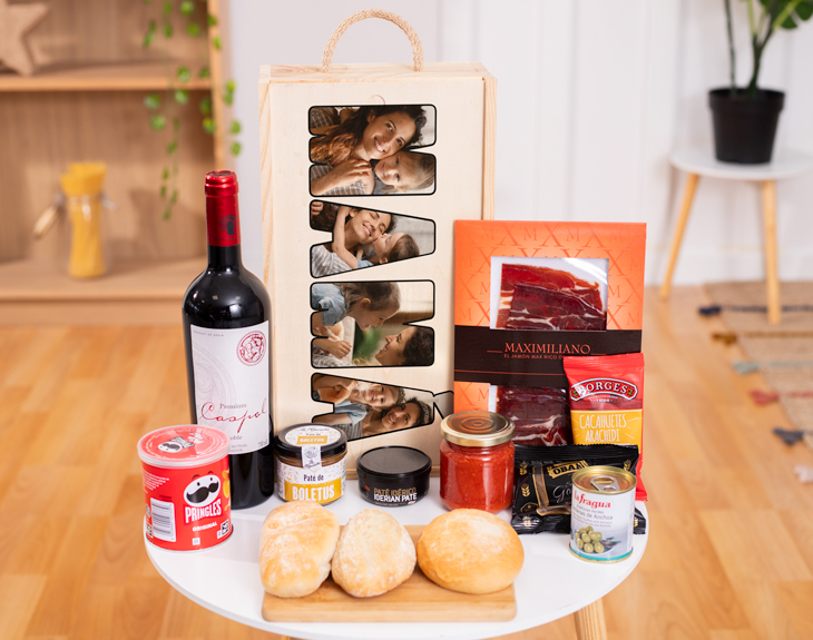 ¿Cuántos momentos has compartido con la mujer que te dio la vida? Tendrás una barbaridad de recuerdos emotivos en los que tu madre es la protagonista. Esos cumpleaños sorpresas que te preparaba de pequeño, esos planes de cine y cena que siempre os montabais los fines de semana, o cuando te llevaba ese riquísimo batido y ese sandwich calentito a la puerta del colegio. El Día de la Madre está a la vuelta de la esquina, y creemos que mamá se merece un regalazo a la altura. Porque sí, podrías comprarle los típicos productos para esta celebración... ¿pero qué hay mejor que una caja repleta de comida? Esta caja de aperitivo personalizada es el detalle perfecto para la mejor madre del mundo. Eso sí, hay que decir que esta caja de madera con asa no es como otra cualquiera. Primero, en su interior encontrarás un surtido de los mejores productos gastronómicos salados, como una botella de vino, jamón, aceitunas, o unas riquísimas Pringles. Por otro lado... ¡podrás añadir vuestras mejores fotos en esta caja! Cada foto formará una letra de la palabra MAMÁ. Así que la mujer que te dio la vida tendrá una sorpresa que nunca olvidará. Dimensiones de la caja: 37x20x10cm Dimensiones de la tapa deslizante: 36,5x19cm Utilizamos como base un exquisito vino de la Tierra de Castilla y León, cuya Certificación de Origen asegura que es un producto de una calidad excepcional. Envejecido en barrica de roble, estamos ante un caldo sorprendente y lleno de matices, cuya botella premium y su elaborado sabor hacen de él el mejor regalo posible. Importante: la caja de madera trae de serie un pequeño círculo superior centrado para abrir cómodamente la caja donde recomendamos no diseñar cosas importantes de la personalización.