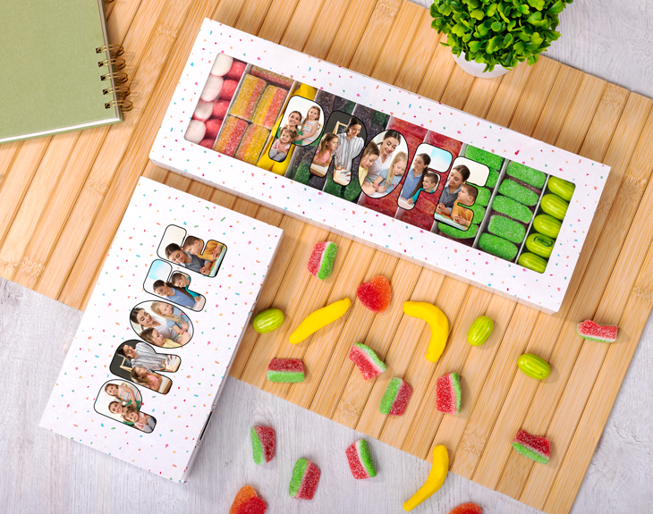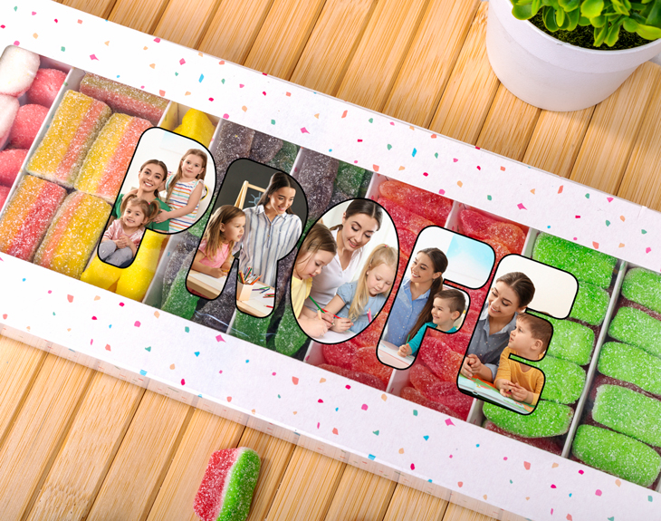 ¡Ha llegado ese ansiado momento! El verano, esa estación que estábamos esperando desde hace meses, por fin ha llegado. Los meses han pasado volando, y ahora es nuestra oportunidad para descansar y relajarnos, tras un año escolar que no ha sido nada fácil. Con esto, no solo nos referimos a los estudiantes o a los padres, sino también a los profesores. Estos magníficos docentes también han pasado un año curioso y lleno de obstáculos. Parece que no, pero llevar las lecciones organizadas y ser conscientes de la evolución de sus alumnos es muy complicado. ¡Ha llegado el momento de recordar esos momentos que han vivido juntos de una forma especial y que sea única! Para ello, contamos con esta caja de chuches personalizada, que le pondrá el punto más dulce a su vida. Si no sabes cuál es la golosina favorita del profe, no te preocupes: en el interior de estas cajas encontrarás una magnífica selección de las mejores chuches para el mejor profe del mundo. Para personalizar este producto, solo tendrás que enviar las fotos que quieres que aparezcan en cada una de las letras. Podrás realizarlo en el diseñador. ¡Rememorad todos esos maravillosos momentos que habéis vivido a lo largo del año con este regalo original para profes! Este producto está disponible en dos formatos: - Caja de chuches: 23 x 13 x 3 cm 40 chuches aprox. (Tapa opaca) - Caja de chuches XL: 37 x 13 x 3 cm. 70 chuches aprox. (Tapa transparente) Importante: si puedes tener reacción a cualquier tipo de alérgenos, puedes escribirnos para consultar si hay alguna opción alternativa.