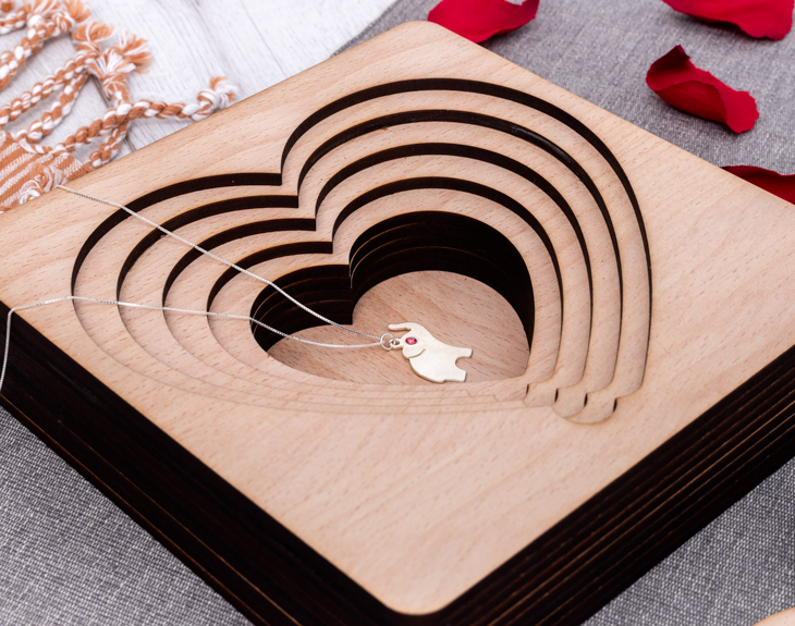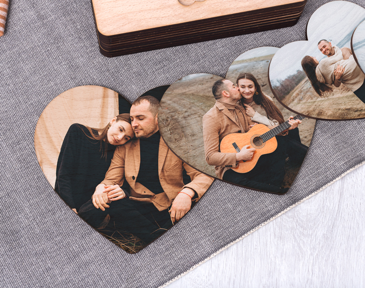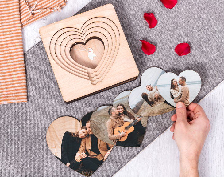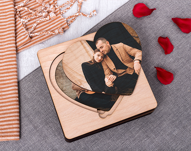 ¿Llevas años con tu pareja y quieres darle una sorpresa de las grandes? Si crees que has encontrado al amor de tu vida y quieres dejarlo claro no hay nada mejor que una buena propuesta de matrimonio por todo lo alto. Si tienes ganas de hacerlo nuestra caja de corazones mágica te ayudará a hacer ese día mucho más especial y lleno de sorpresa. Ponte en situación: imagina que tu pareja a la que amas con locura te entrega una misteriosa caja con la tapa en forma de corazón, una vez quite la primera pieza vendrá otra, luego otra más y por último la pieza final que destapará la sorpresa del siglo: ¡el anillo! Como si de una matrioshka amorosa se tratase. Puedes currarte unas palabras bonitas o dejar que el asunto fluya: eso lo dejamos a tu elección, al igual que las 4 fotos que decorarán esta madera. Y es que esta caja no es sólo ideal para pedidas de matrimonio, puedes darle cualquier tipo de sorpresa: ese viaje que tanto deseáis hacer, entradas para un concierto, otra pieza de joyería... Es sin duda un regalo original perfecto para San Valentín o cualquier otra fecha que signifique algo en vuestra relación. Si quieres sorprender de la manera más original con esta caja le dejarás sin palabras y podréis guardar este recuerdo único para el resto de vuestras vidas. Tenemos dos opciones: la caja sin relleno y otra opción que incluye kinder choco-bons al final de los corazones para que sea una dulce sorpresa. Medidas: 17,5 x 17,5 x 3,5 cm
