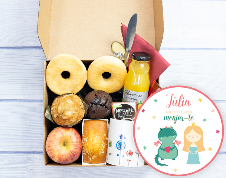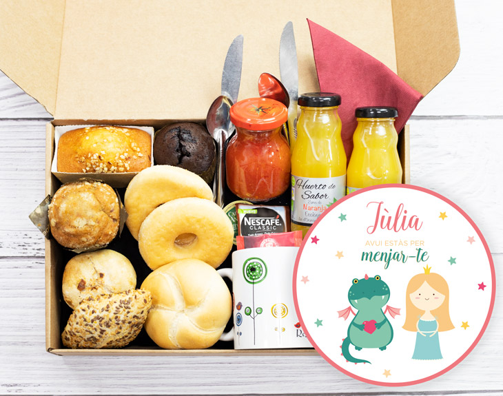 ¿Te imaginas lo genial que sería que tu pareja reciba un desayuno a domicilio el día de Sant Jordi? Seguro que se emociona al máximo con este regalo tan especial y comienza el día con las pilas cargadas. ¿Qué mejor manera de celebrar una de las fiestas más especiales de nuestro país? En nuestro desayuno Estàs per menjar-te, el dragón y la princesa de la leyenda son los protagonistas, pero dándole un tono más tierno y romántico ya que, en esta ocasión, el dragón quiere comerse a besos a la tierna princesa y ¿qué mejor forma de hacerlo que con un delicioso desayuno? Lo más genial de este desayuno es que ese diseño tan bonito puedes personalizarlo con el nombre de la persona destinataria. Solo tienes que indicarnos el nombre que deseas incluir en la pegatina personalizada que pondremos en la cajita del desayuno y harás el regalo el doble de especial. Además, dispondrás de la opción de escoger el diseño con el texto en catalán o en español. Escoge si deseas tu desayuno personalizado para 1 o 2 personas y el día en que quieres recibirlo y nosotros lo mandamos a la dirección sin demora. Las rosas y los libros son regalos fantásticos, pero demasiado clásicos. ¿Qué tal si le das una vuelta al clásico regalo de estas fechas y optas por un detalle tan sorprendente como delicioso? ¿Cómo se graba el mensaje? ¡Es muy fácil! Añade el desayuno al carrito y dale al botón de "personalizar". Podrás grabar un mensaje en ese momento (con el micro del móvil o del ordenador) y nosotros nos encargaremos de incluirlo en el desayuno. El mensaje tiene un límite de 30 segundos. ¡Ahí podrás decirle lo que quieras!