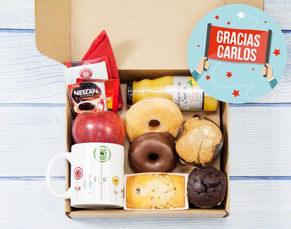 Contenido para 1 persona: • Caja (personalizada o sin personalizar). • Taza blanca (personalízala por 5€). • Manzana roja. • Café. • Té de varios sabores. • Zumo ecológico (Huerto de Sabor). • Bollería Artesanal: -Coulant de chocolate (artesanal). -Muffins con pepitas. (artesanal). -Donuts. -Mini Donuts. • Servilleta. • Tarjeta Recordatoria. Contenido para 2 personas: • Caja (personalizada o sin personalizar). • 2 Tazas blancas (personaliza cada una por 5€). • 2 Cafés. • Té de varios sabores. • 2 Zumos ecológico (Huerto de Sabor). • Bollería Artesanal: -Coulant de chocolate (artesanal). -Muffins con pepitas. (artesanal). -Donuts. -Mini Donuts. • Panes artesanales: - Pan chapata - Pan de cristal. - Pan brioche. • Tomate rosa de Barbastro triturado (300g). • 2 Aceites de oliva ecológicos 10 ml. • 2 cuberterías. • 2 servilletas. • Tarjeta Recordatoria. Las tazas y los termos personalizados reemplazarán a los del desayuno. ¿Cómo incluir los productos opcionales? Una vez hayas seleccionado el tipo de desayuno, en el apartado de adicionales (paso 2) podrás añadir todos los productos opcionales que quieras.