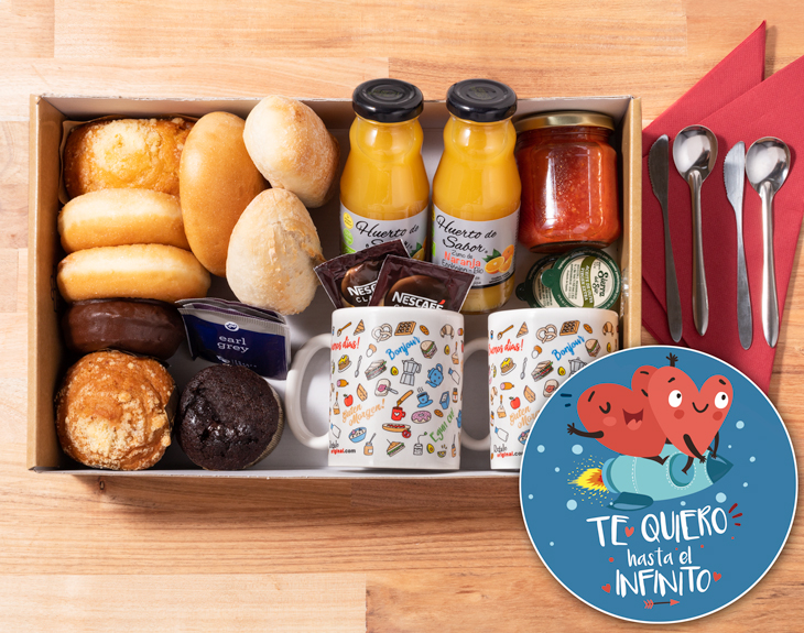Contenido para 1 persona: • Caja . • Taza blanca (personalízala por 5€). • Manzana roja (opcional). • Café. • Té de varios sabores. • Zumo ecológico (Huerto de Sabor). • Bollería Artesanal: -Coulant de chocolate (artesanal). -Muffins con pepitas. (artesanal). -Donuts. -Mini Donuts. • Servilleta. • Tarjeta Recordatoria. Contenido para 2 personas: • Caja . • 2 Tazas blancas (personaliza cada una por 5€). • 2 Cafés. • Té de varios sabores. • 2 Zumos ecológico (Huerto de Sabor). • Bollería Artesanal: -Coulant de chocolate (artesanal). -Muffins con pepitas. (artesanal). -Donuts. -Mini Donuts. • Panes artesanales: - Pan chapata. - Pan de cristal. - Pan brioche. • Tomate rosa de Barbastro triturado (300g). • 2 Aceites de oliva ecológicos 10 ml. • 2 cuberterías. • 2 servilletas. • Tarjeta Recordatoria. Las tazas y los termos personalizados reemplazarán a los del desayuno. ¿Cómo incluir los productos opcionales? Una vez hayas seleccionado el tipo de desayuno, en el apartado de adicionales (paso 2) podrás añadir todos los productos opcionales que quieras.