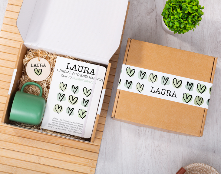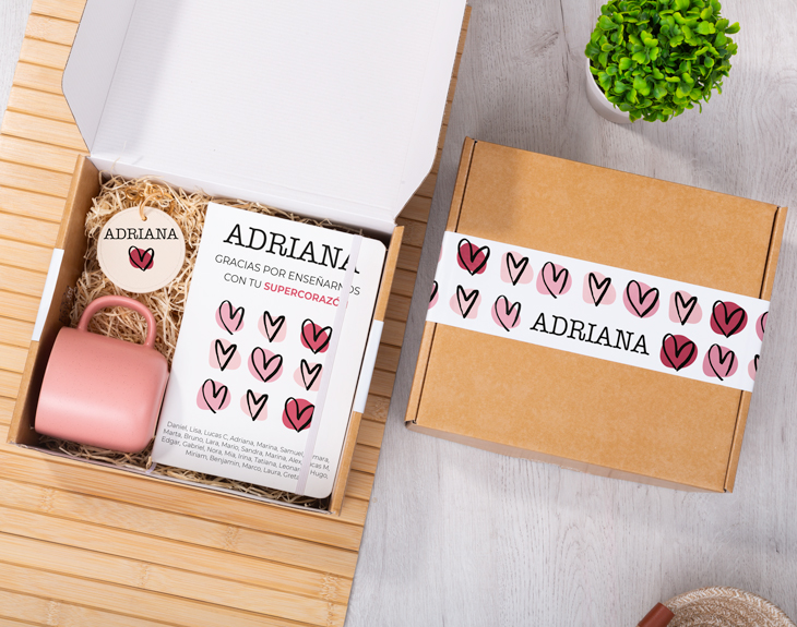 ¿Estáis buscando un regalo para agradecer a la mejor profe del mundo todo lo que ha hecho por vosotros? Si este curso habéis tenido la suerte de coincidir con una increíble profesional que ha sabido enseñaros desde el corazón, esta caja de esenciales del profe personalizada tiene su nombre. Incluye todo lo necesario para su día a día, un precioso bloc personalizado para apuntar tareas, un elegante llavero para no perder las llaves de clase y una taza para disfrutar de su café en esas largas tardes corrigiendo exámenes. Seguro que a partir de ahora se convierten en sus indispensables, ¡no saldrá de casa sin ellos! Con la ayuda de nuestro diseñador podréis personalizarla rápidamente, por una parte os pediremos el nombre para el llavero y para la pegatina, por otra, el texto para el cuaderno. Ahí podréis incluir los nombres de todos los alumnos, de esta manera guardará para siempre un bonito recuerdo de sus alumnos favoritos. Además, el diseño está disponible en verde, rosa y azul, ¡podréis escoger el preferido de la profe!