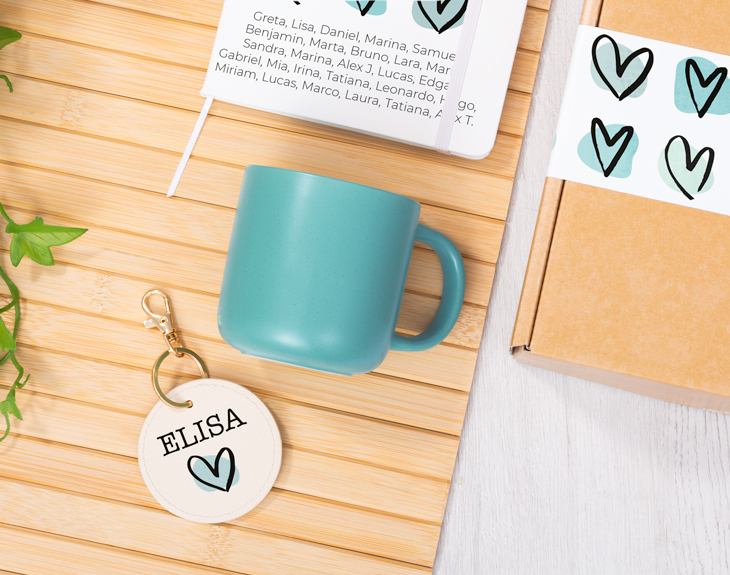 • Caja personalizada. • Bloc de notas personalizado 14x21 (80 hojas). • Llavero personalizado. • Taza de cerámica 370ml (apta para lavavajillas) • Tarjeta recordatoria.