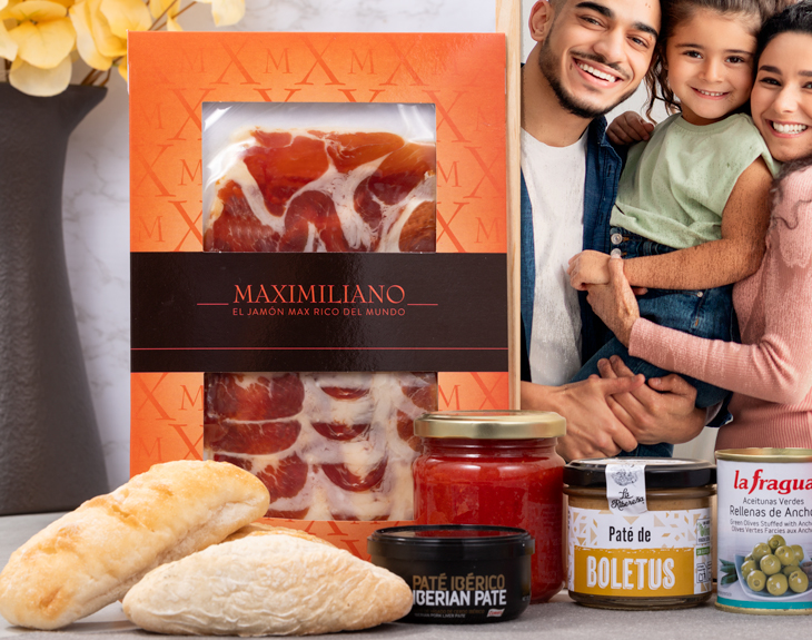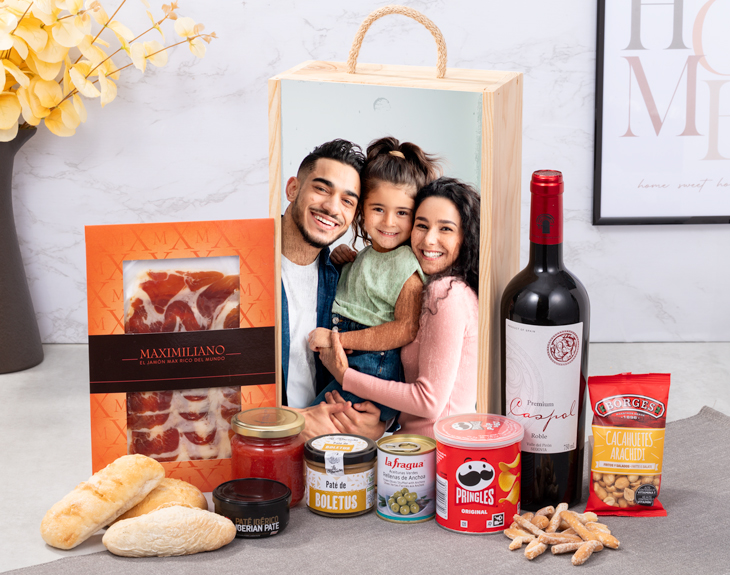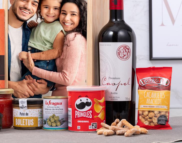 • Caja de madera con tapa deslizante y asa. • Jamón doble equis Maximiliano Jabugo 50g. • Tomate triturado con ajo y aceite de oliva La Carretilla 185g. • Aceitunas verdes rellenas de Anchoas La Fragua 125g. • Paté La Ribereña 110g (varía según stock). • Paté Ibérico a la pimienta verde Coren 78g • Pringles 40g. • Cacahuetes salados Frit Ravich 40g. • Vino tinto Valpirón 14,5% 75cl. • Picos Obando Selección Gourmet 20g • Pack de tres panes artesanales • Tarjeta Recordatoria. ¿Cómo incluir los productos opcionales? Una vez hayas seleccionado el tipo de desayuno, en el apartado de adicionales (paso 2) podrás añadir todos los productos opcionales que quieras.