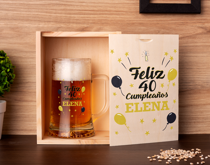 ¿Es el cumpleaños de tu amigo/familiar y no sabes qué regalarle, pero compartís una pasión exacerbada por la cerveza? Con nuestra caja de madera personalizada para cumpleaños puedes tener ese regalo que le sorprenda a un buen amante de la archiconocida bebida espirituosa. Esta caja de madera personalizada dispone de abertura superior para quitar la tapa y añadir la jarra que quieras... ¡O lo que más te guste! Podrás escoger entre tres opciones distintas: caja individual personalizada, caja personalizada junto con la jarra, y el pack completo con la caja y la jarra personalizadas, para que tengas todas las opciones que quieras. Las medidas de esta caja de madera son de 21,5 centímetros de alto por 16 centímetros de largo. De profundidad tiene nada menos que 10 centímetros. ¡Para que quepa esa jarra de cerveza que tanto nos gusta! Diseñar este producto es tan fácil como añadirlo al carrito, entrar a nuestro diseñador y poner el nombre que quieres que aparezca en la caja. ¡O en ambos! Recuerda que irá diseñado con la misma tipografía que ves en nuestro ejemplo web. Medidas de la caja: 21,5 x 16 x 10 centímetros. Material: madera. Capacidad de la jarra: 50cl. Diámetro interior: 7cm. Medidas aproximadas: 8,5x15,5cm.