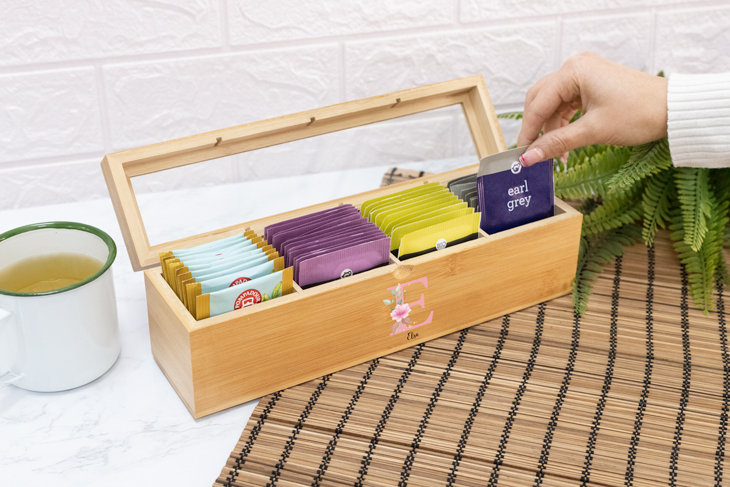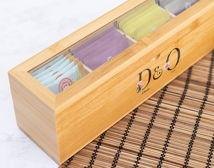 Tomarse un té bien calentito es una de las cosas más relajantes que podemos hacer. El té y las infusiones se han puesto muy de moda, se ha convertido en una de las bebidas que más triunfa entre la gente por la cantidad de sabores y tipo que podemos elegir. Por eso, si quieres hacerle el mejor regalo del mundo a esa persona amante del té, esta caja de madera personalizada es perfecta. Ideal para colocarla en tu cocina o incluso en la oficina y tener todas tus bolsitas de té organizadas y siempre a mano. Gracias a sus cuatro compartimentos, podrás guardar muchas bolsitas. ¡Es súper práctico! Si estás pensando en qué regalo hacer en un cumpleaños o evento cercano y esa persona no puede vivir sin su ración de té diaria, no hay mejor regalo que esta original caja de madera con un diseño precioso y de lo más elegante. Esta caja es súper útil, ya que su tamaño permite guardar muchas bolsitas y además cuenta con un cristal en la tapa para que puedas tener siempre tus bolsitas a la vista, sin tener que abrir la caja. Si no puedes esperar para utilizar esta súper caja, no te olvides que antes tienes que personalizar esta caja para té. En su diseño podrás añadir las iniciales que quieras, rodeadas de plantas y flores. Es todo un detallazo para esa persona tan especial, le encantará recibir este regalo personalizado y hecho a medida. Medidas: 29,5 x 9 x 7,8 cm. Importante: La caja no incluye tés. Importante: Las maderas tienen vetas y estas quedan reflejadas en la imagen.