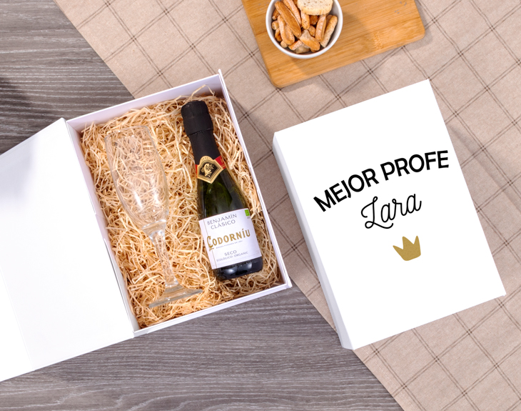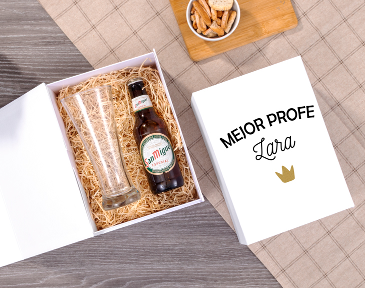 El fin de curso está a la vuelta de la esquina y ha llegado el momento de agradecerle a ese/a gran profesor/a todo lo que ha hecho por sus alumnos a lo largo del curso. ¿Y qué mejor forma de hacerlo que con un kit premium con bebida personalizado como este? ¡Podrás elegir el complemento que quieras para este detalle hecho para el/la profe más especial! Este kit especial con bebida a elegir y copa con diseño de profes está formado principalmente por una bebida (a elegir entre cerveza, vino o cava) y su respectiva copa, dependiendo de la elección. Estos vendrán presentados en el interior de esta caja negra con cierre de imán, con unas medidas de 25 centímetros de largo por 18 de ancho y 11 de profundidad. Un regalo original para profesores como este será la clave para demostrarle lo duro que ha trabajado a lo largo del curso. Escoge el pack que más te guste entre los tres disponibles y añádelo al carrito. Después solo tendrás que personalizar la cubierta de la caja con el nombre del mejor maestro del mundo. ¡Nosotros nos encargaremos de crear un pack único para él o ella. Medidas de la caja: 25 x 18 x 11 cm.