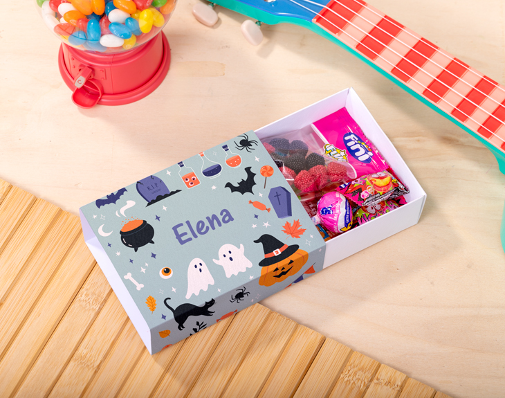 Además, esta cajita terrorífica dulce, con su diseño de fantasmas, calabazas que dan miedo y murciélagos negros que asustan, la puedes personalizar con un nombre o una frase corta. ¿Qué te parece “Dulce o trato”? Quedaría genial, pero tú decides. Lo que elijas quedará perfecto.