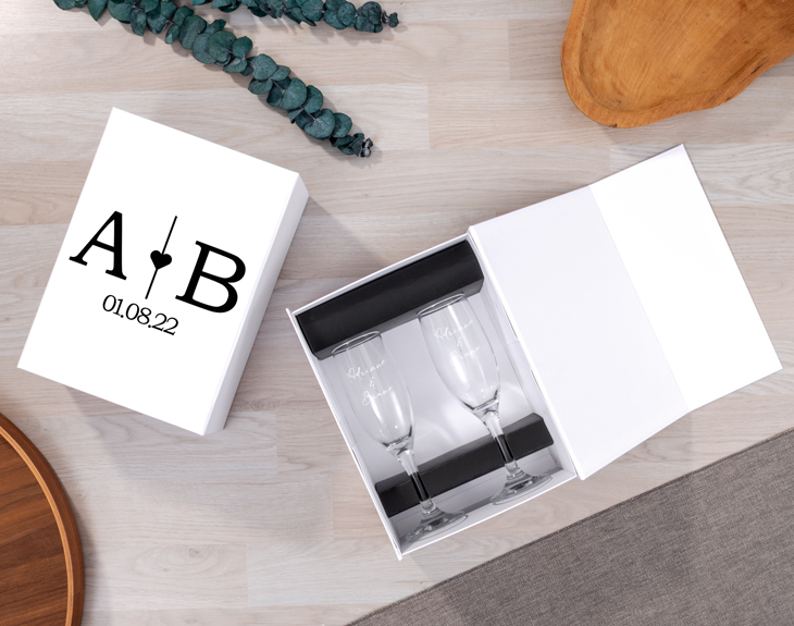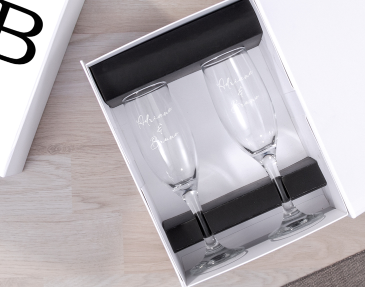 • Caja de cartón blanca (25x18x11cm). • Copa de cristal de cava grabada. • Tarjeta Recordatoria.