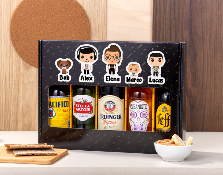 ¿Por qué elegir una sola cerveza cuando puedes tenerlas todas, o la misma pero varias veces? No se trata solo del sabor, sino de la presentación y la decoración. Disfruta de lo mejor en ambos sentidos con este pack premium de las mejores cervezas del mundo. Desde la belga Leffe Blonde hasta la mexicana Pacífico, o la latina Cubanisto. ¡Siente el sabor de los mejores países! Lo mejor de este regalo original para los más cerveceros es que no solo disfrutarán del sabor. Los cinco botellines que escojas vendrán bien sujetos en esta chulísima caja de cartón personalizada. ¡Convierte a tus amigos compañeros de cañas en tu familia Tinok! Escoge entre los cientos de personajes los que más se os parezcan y nosotros os colocaremos pegados sobre la tapa. Porque lo mejor de la cerveza es poder compartirla con tu gente. Y si vivís lejos, dinos la dirección de esa persona especial y nosotros le mandamos esta caja de cartón para cervezas personalizada directamente a su casa, ya sea que viva en España, en Alemania o en Italia. Importante: La disposición de los personajes será realizada por nuestros diseñadores gráficos, adaptando el número de personajes lo mejor posible para conseguir un resultado óptimo. El kit incluye cinco cervezas diferentes: - Pacífico: cerveza mexicana de agua, malta de cebada, arroz y lúpulo. 33cl. *Si Pacífico presenta problemas de suministro, este modelo de cerveza se sustituirá por otro similar e igual de delicioso. - Leffe Blonde: cerveza belga legendaria con una historia que se remonta al año 1240 en la ciudad de Dinant. 33cl. - Stella Artois: cerveza lager belga suave y con un frescor muy característico. 33cl. - Erdinger: cerveza de trigo de tradición bávara considerada la cervecería más grande del mundo. 50cl. - Cubanisto: cerveza de aroma cubano aromatizada con Ron y especias con sabor afrutado de naranja, limón y lima. 33 cl. Importante: Las cervezas que contiene el pack pueden variar según stock. El resto de cervezas disponibles son: - San Miguel 0,0% 25cl. - San Miguel Especial 25cl. - San Miguel sin glúten 33cl. - Cubanisto: cerveza cubana al estilo lager brillante con un toque de ron cubano y especias. 22cl. - Mica: cerveza artesana española elaborada en la Sierra de Fuentenebro al amparo de este mineral con una cebada excelente. 33cl.