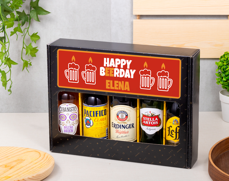 Seguro que tienes un amigo/a que ve la vida a través de una cerveza. Los días de la semana, los planes que hace... ¡hasta los años que cumple! Este año, déjate de tartas y dale por su cumpleaños el auténtico regalo que le hará ilusión: un gran pack premium de las mejores cervezas. Podrás felicitarle con un mensaje personalizado. Y en lugar de velas, ¡a soplar botellines! Tu tarjeta de felicitaciones será esta colorida pegatina personalizada sobre la que podrás escribir el nombre del cumpleañero/a. ¡Deséale un Happy Beerday! ¿Y de que estará hecha esta especie de tarta de cervezas? Podrás elegir sus 5 ingredientes principales en función de los gustos de tu amigo/a, para que tenga un gran regalo original para cumpleaños. Desde la Cubanisto o la Mica hasta las clásicas San Miguel Especial o incluso sin glúten. Llena esta caja de cartón para cervezas personalizada con el alcohol que no puede faltar en la fiesta de cumpleaños de esa persona tan especial. El kit incluye cinco cervezas diferentes: - Pacífico: cerveza mexicana de agua, malta de cebada, arroz y lúpulo. 33cl. *Si Pacífico presenta problemas de suministro, este modelo de cerveza se sustituirá por otro similar e igual de delicioso. - Leffe Blonde: cerveza belga legendaria con una historia que se remonta al año 1240 en la ciudad de Dinant. 33cl. - Stella Artois: cerveza lager belga suave y con un frescor muy característico. 33cl. - Cubanisto: cerveza de aroma cubano aromatizada con Ron y especias con sabor afrutado de naranja, limón y lima. 33 cl. - Erdinger: cerveza de trigo de tradición bávara considerada la cervecería más grande del mundo. 50cl. Importante: Las cervezas que contiene el pack pueden variar según stock. El resto de cervezas disponibles son: - San Miguel 0,0% 25cl. - San Miguel Especial 25cl. - San Miguel sin glúten 33cl. - Cubanisto: cerveza cubana al estilo lager brillante con un toque de ron cubano y especias. 22cl. - Mica: cerveza artesana española elaborada en la Sierra de Fuentenebro al amparo de este mineral con una cebada excelente. 33cl.