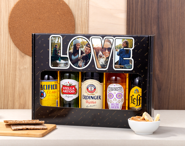 ¡Cuántos buenos momentos habéis pasado juntos con una buena bebida de por medio! ¿No te gustaría recordarlos de una manera original a la vez que compartís más tiempos especiales? Sorprende a tu pareja en vuestra próxima cita con el romántico diseño de este pack premium de las mejores cervezas. ¡Inmortaliza bajo la palabra "LOVE" esas imágenes que muestran el amor que tenéis! Podrás añadir una por cada letra. Tengáis los gustos que tengáis, este regalo original para las parejas más cerveceras se adapta completamente a vuestro gusto. Además de personalizar el diseño de amor, podrás escoger los 5 botellines a incluir: desde cervezas San Miguel tradicionales hasta las más exóticas de Cuba o México. Y si no te decides, ¡puedes escoger el kit con una variedad de los cinco tipos más novedosos! Brindad por más años de relación con los botellines clásicos, y luego podréis conservar de recuerdo la caja de cartón para cervezas personalizada. El kit incluye cinco cervezas diferentes: - Pacífico: cerveza mexicana de agua, malta de cebada, arroz y lúpulo. 33cl. *Si Pacífico presenta problemas de suministro, este modelo de cerveza se sustituirá por otro similar e igual de delicioso. - Leffe Blonde: cerveza belga legendaria con una historia que se remonta al año 1240 en la ciudad de Dinant. 33cl. - Stella Artois: cerveza lager belga suave y con un frescor muy característico. 33cl. - Cubanisto: cerveza de aroma cubano aromatizada con Ron y especias con sabor afrutado de naranja, limón y lima. 33 cl. - Erdinger: cerveza de trigo de tradición bávara considerada la cervecería más grande del mundo. 50cl. Importante: Las cervezas que contiene el pack pueden variar según stock. El resto de cervezas disponibles son: - San Miguel 0,0% 25cl. - San Miguel Especial 25cl. - San Miguel sin glúten 33cl. - Cubanisto: cerveza cubana al estilo lager brillante con un toque de ron cubano y especias. 22cl. - Mica: cerveza artesana española elaborada en la Sierra de Fuentenebro al amparo de este mineral con una cebada excelente. 33cl.